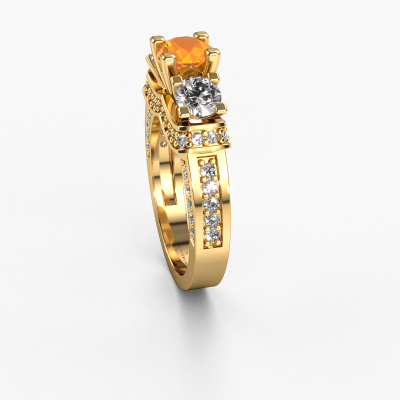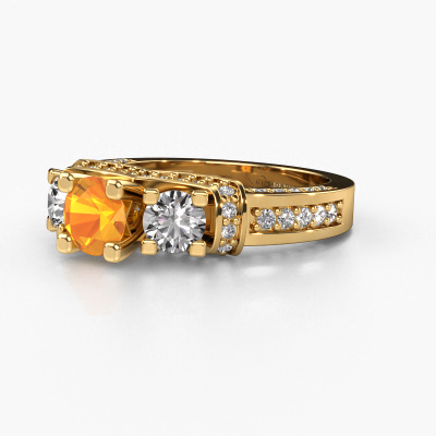 Dieser Ring aus 14 Karat Gold heißt Phileine und hat 5 mm Citrin. Dieser gewagte 14 Karat Gold 3-stone Verlobungsring ist ein wahres Kunstwerk! Die Ornamente werden mit viel Geduld und großer Leidenschaft gefertigt. Um diesen Ring mit großer Präzision zu schaffen, erfordert dieses Handwerk ein scharfes Auge und eine geschickte Hand. Eine Herausforderung, die bei unseren erfahrenen Juwelieren ein Feuer entfacht. Die exquisiten Citrin sind auf eine besondere Art und Weise gefasst, so dass sie noch mehr hervorstechen. Dies verleiht dem Ring eine noch glamourösere Erscheinung. Der Ring an sich ist schon wegen der Edelsteine einzigartig, die wir speziell für diesen Ring auswählen. Obendrein wählen Sie die Edelmetalle aus, mit denen Ihr einzigartiger Ring für die außergewöhnlichste Frau Ihres Lebens gemacht wird! Jedes Schmuckstück wird hergestellt mit Leidenschaft und Liebe, von einem unserer Meister-Goldschmiede.Nach Erhalt Ihrer Bestellung beginnen unsere Goldschmiede mit Leidenschaft den kreativen Prozess und fertigen Ihren Verlobungsring in unserem eigenen Studio. Da wir keine großen Lager haben, werden diese Kosten nicht an Sie weitergegeben. Unsere Preisgestaltung ist der Beweis dafür! Wir bieten Schmuck zum niedrigsten Preis, garantiert.Verschiedene Arten von neuen Ringen werden täglich von unserem Team angefertigt. Vielleicht haben Sie irgendwo einen 3-stone Verlobungsring gefunden. Einen, den Sie Ihrem Liebsten schenken möchten. Bitte zögern Sie nicht, unseren Schmuckdesignern Ihre Gedanken und Ihr Design zu zeigen. Wir würden gerne Ihr Design in einen exklusive Verlobungsring verwandeln. Sie können die Entwicklungen Ihres Ringdesigns verfolgen, da wir sehr detaillierte 3D-Zeichnungen verwenden. Darüber hinaus können Sie einen Dummy des Designs bestellen. Ein Dummy ist ein Kunststoffring, der nach Ihrem Ringdesign gestaltet werden kann. Sie können ihn anprobieren und prüfen, ob der Verlobungsring Ihren Vorstellungen entspricht. Wir senden Ihnen gerne ein unverbindliches Angebot zu einem fairen Preis/Leistungsverhältnis. Das Angebot wird Sie angesichts der Qualität des Rings und der Edelsteine verblüffen.Um es einfacher zu machen, bieten wir eine kostenlose 30-tägige Rücksendung.