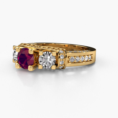 Dieser Ring aus 14 Karat Gold heißt Phileine und hat 5 mm Rhodolit. Dieser gewagte 14 Karat Gold 3-stone Verlobungsring ist ein wahres Kunstwerk! Die Ornamente werden mit viel Geduld und großer Leidenschaft gefertigt. Um diesen Ring mit großer Präzision zu schaffen, erfordert dieses Handwerk ein scharfes Auge und eine geschickte Hand. Eine Herausforderung, die bei unseren erfahrenen Juwelieren ein Feuer entfacht. Die exquisiten Rhodolit sind auf eine besondere Art und Weise gefasst, so dass sie noch mehr hervorstechen. Dies verleiht dem Ring eine noch glamourösere Erscheinung. Der Ring an sich ist schon wegen der Edelsteine einzigartig, die wir speziell für diesen Ring auswählen. Obendrein wählen Sie die Edelmetalle aus, mit denen Ihr einzigartiger Ring für die außergewöhnlichste Frau Ihres Lebens gemacht wird! Jedes Schmuckstück wird hergestellt mit Leidenschaft und Liebe, von einem unserer Meister-Goldschmiede.Nach Erhalt Ihrer Bestellung beginnen unsere Goldschmiede mit Leidenschaft den kreativen Prozess und fertigen Ihren Verlobungsring in unserem eigenen Studio. Da wir keine großen Lager haben, werden diese Kosten nicht an Sie weitergegeben. Unsere Preisgestaltung ist der Beweis dafür! Wir bieten Schmuck zum niedrigsten Preis, garantiert.Verschiedene Arten von neuen Ringen werden täglich von unserem Team angefertigt. Vielleicht haben Sie irgendwo einen 3-stone Verlobungsring gefunden. Einen, den Sie Ihrem Liebsten schenken möchten. Bitte zögern Sie nicht, unseren Schmuckdesignern Ihre Gedanken und Ihr Design zu zeigen. Wir würden gerne Ihr Design in einen exklusive Verlobungsring verwandeln. Sie können die Entwicklungen Ihres Ringdesigns verfolgen, da wir sehr detaillierte 3D-Zeichnungen verwenden. Darüber hinaus können Sie einen Dummy des Designs bestellen. Ein Dummy ist ein Kunststoffring, der nach Ihrem Ringdesign gestaltet werden kann. Sie können ihn anprobieren und prüfen, ob der Verlobungsring Ihren Vorstellungen entspricht. Wir senden Ihnen gerne ein unverbindliches Angebot zu einem fairen Preis/Leistungsverhältnis. Das Angebot wird Sie angesichts der Qualität des Rings und der Edelsteine verblüffen.Um es einfacher zu machen, bieten wir eine kostenlose 30-tägige Rücksendung.