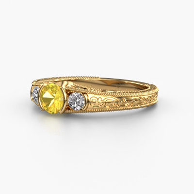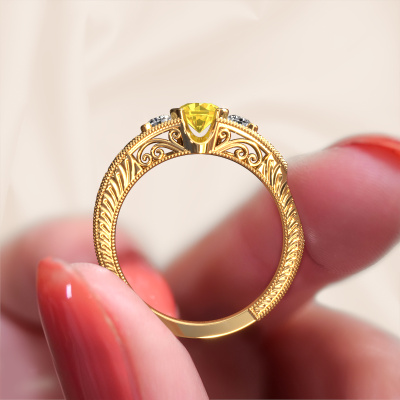 Dieser Filigrane Verlobungsring aus 14 Karat Gold heißt Tasia und hat 5 mm Gelb Saphir. Ist Ihre Freundin von Vintage begeistert? Dann wird dieser Gold Verlobungsring sicherlich perfekt zu ihrem Stil passen. Ein trendiger Ring mit einem Hauch von klassischem Schmuck. Ein wirklich atemberaubendes, romantisches Design! Vor allem, wenn Sie den Ring nach ihren Wünschen anpassen. Dieser Vintage 3-stone Verlobungsring ist mit atemberaubenden Gelb Saphir besetzt. Wie Sie sehen können, sind Sie der Boss bei der Auswahl des Edelsteins, der am besten zu Ihrer Freundin passt. Jeder Edelstein wird sorgfältig von unseren Händlern ausgewählt, die auf der ganzen Welt verteilt sind. Nichts als die besten Edelsteine für unseren erfahrenen Juwelier! Schließlich ist es seine Krönung! Jedes Schmuckstück wird hergestellt mit Leidenschaft und Liebe, von einem unserer Meister-Goldschmiede.Durch die Kombination modernster Technik mit uralter Handwerkskunst können wir alle Verlobungsringe in unserem eigenen Studio anfertigen. Jedes Schmuckstück wird auf Anfrage gefertigt. Das ist vorteilhaft, weil wir Ihnen dadurch einen Preis anbieten können, den Sie nirgendwo anders finden.Unser Team fügt unserer Online-Kollektion täglich neue Designs hinzu. Unsere Designer und Goldschmiede arbeiten zusammen, um das beste Design zu kreieren. Wir bemühen uns, eine vielfältige Kollektion von Schmuckstücken anzubieten. Vielleicht haben Sie ein bestimmtes Design im Sinn. Eines, dass Sie irgendwo gesehen haben. Gerne geben wir Ihnen eine kostenlose Beratung. Wir machen Ihnen ein Angebot, basierend auf einem fairen Preis/Leistungsverhältnis, das Sie verblüffen wird.Um es einfacher zu machen, bieten wir eine kostenlose 30-tägige Rücksendung.