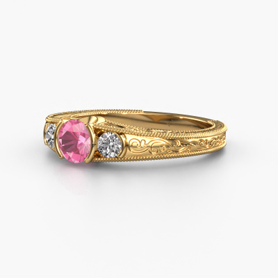 Dieser Filigrane Verlobungsring aus 14 Karat Gold heißt Tasia und hat 5 mm Pink Saphir. Ist Ihre Freundin von Vintage begeistert? Dann wird dieser Gold Verlobungsring sicherlich perfekt zu ihrem Stil passen. Ein trendiger Ring mit einem Hauch von klassischem Schmuck. Ein wirklich atemberaubendes, romantisches Design! Vor allem, wenn Sie den Ring nach ihren Wünschen anpassen. Dieser Vintage 3-stone Verlobungsring ist mit atemberaubenden Pink Saphir besetzt. Wie Sie sehen können, sind Sie der Boss bei der Auswahl des Edelsteins, der am besten zu Ihrer Freundin passt. Jeder Edelstein wird sorgfältig von unseren Händlern ausgewählt, die auf der ganzen Welt verteilt sind. Nichts als die besten Edelsteine für unseren erfahrenen Juwelier! Schließlich ist es seine Krönung! Jedes Schmuckstück wird hergestellt mit Leidenschaft und Liebe, von einem unserer Meister-Goldschmiede.Durch die Kombination modernster Technik mit uralter Handwerkskunst können wir alle Verlobungsringe in unserem eigenen Studio anfertigen. Jedes Schmuckstück wird auf Anfrage gefertigt. Das ist vorteilhaft, weil wir Ihnen dadurch einen Preis anbieten können, den Sie nirgendwo anders finden.Unser Team fügt unserer Online-Kollektion täglich neue Designs hinzu. Unsere Designer und Goldschmiede arbeiten zusammen, um das beste Design zu kreieren. Wir bemühen uns, eine vielfältige Kollektion von Schmuckstücken anzubieten. Vielleicht haben Sie ein bestimmtes Design im Sinn. Eines, dass Sie irgendwo gesehen haben. Gerne geben wir Ihnen eine kostenlose Beratung. Wir machen Ihnen ein Angebot, basierend auf einem fairen Preis/Leistungsverhältnis, das Sie verblüffen wird.Um es einfacher zu machen, bieten wir eine kostenlose 30-tägige Rücksendung.