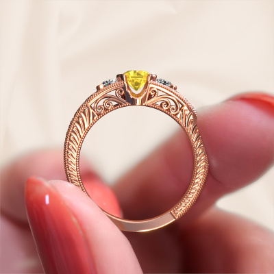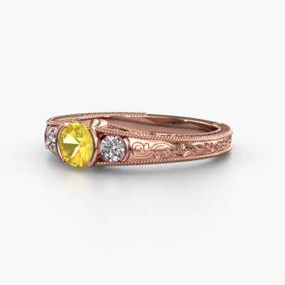 Dieser Filigrane Verlobungsring aus 14 Karat Roségold heißt Tasia und hat 5 mm Gelb Saphir. Ist Ihre Freundin von Vintage begeistert? Dann wird dieser Roségold Verlobungsring sicherlich perfekt zu ihrem Stil passen. Ein trendiger Ring mit einem Hauch von klassischem Schmuck. Ein wirklich atemberaubendes, romantisches Design! Vor allem, wenn Sie den Ring nach ihren Wünschen anpassen. Dieser Vintage 3-stone Verlobungsring ist mit atemberaubenden Gelb Saphir besetzt. Wie Sie sehen können, sind Sie der Boss bei der Auswahl des Edelsteins, der am besten zu Ihrer Freundin passt. Jeder Edelstein wird sorgfältig von unseren Händlern ausgewählt, die auf der ganzen Welt verteilt sind. Nichts als die besten Edelsteine für unseren erfahrenen Juwelier! Schließlich ist es seine Krönung! Jedes Schmuckstück wird hergestellt mit Leidenschaft und Liebe, von einem unserer Meister-Goldschmiede.Durch die Kombination modernster Technik mit uralter Handwerkskunst können wir alle Verlobungsringe in unserem eigenen Studio anfertigen. Jedes Schmuckstück wird auf Anfrage gefertigt. Das ist vorteilhaft, weil wir Ihnen dadurch einen Preis anbieten können, den Sie nirgendwo anders finden.Unser Team fügt unserer Online-Kollektion täglich neue Designs hinzu. Unsere Designer und Goldschmiede arbeiten zusammen, um das beste Design zu kreieren. Wir bemühen uns, eine vielfältige Kollektion von Schmuckstücken anzubieten. Vielleicht haben Sie ein bestimmtes Design im Sinn. Eines, dass Sie irgendwo gesehen haben. Gerne geben wir Ihnen eine kostenlose Beratung. Wir machen Ihnen ein Angebot, basierend auf einem fairen Preis/Leistungsverhältnis, das Sie verblüffen wird.Um es einfacher zu machen, bieten wir eine kostenlose 30-tägige Rücksendung.