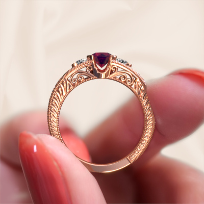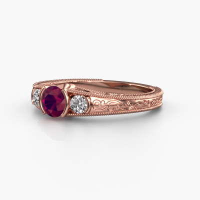 Dieser Filigrane Verlobungsring aus 14 Karat Roségold heißt Tasia und hat 5 mm Rhodolit. Ist Ihre Freundin von Vintage begeistert? Dann wird dieser Roségold Verlobungsring sicherlich perfekt zu ihrem Stil passen. Ein trendiger Ring mit einem Hauch von klassischem Schmuck. Ein wirklich atemberaubendes, romantisches Design! Vor allem, wenn Sie den Ring nach ihren Wünschen anpassen. Dieser Vintage 3-stone Verlobungsring ist mit atemberaubenden Rhodolit besetzt. Wie Sie sehen können, sind Sie der Boss bei der Auswahl des Edelsteins, der am besten zu Ihrer Freundin passt. Jeder Edelstein wird sorgfältig von unseren Händlern ausgewählt, die auf der ganzen Welt verteilt sind. Nichts als die besten Edelsteine für unseren erfahrenen Juwelier! Schließlich ist es seine Krönung! Jedes Schmuckstück wird hergestellt mit Leidenschaft und Liebe, von einem unserer Meister-Goldschmiede.Durch die Kombination modernster Technik mit uralter Handwerkskunst können wir alle Verlobungsringe in unserem eigenen Studio anfertigen. Jedes Schmuckstück wird auf Anfrage gefertigt. Das ist vorteilhaft, weil wir Ihnen dadurch einen Preis anbieten können, den Sie nirgendwo anders finden.Unser Team fügt unserer Online-Kollektion täglich neue Designs hinzu. Unsere Designer und Goldschmiede arbeiten zusammen, um das beste Design zu kreieren. Wir bemühen uns, eine vielfältige Kollektion von Schmuckstücken anzubieten. Vielleicht haben Sie ein bestimmtes Design im Sinn. Eines, dass Sie irgendwo gesehen haben. Gerne geben wir Ihnen eine kostenlose Beratung. Wir machen Ihnen ein Angebot, basierend auf einem fairen Preis/Leistungsverhältnis, das Sie verblüffen wird.Um es einfacher zu machen, bieten wir eine kostenlose 30-tägige Rücksendung.