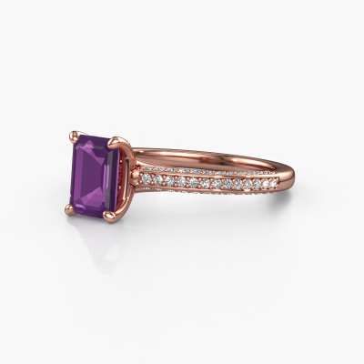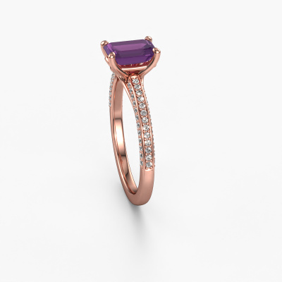 Der oben gezeigte Ring wird Elenore eme genannt. Es ist ein Pavé Solitär Ring, da er einen zentralen Edelstein und ein Band mit Pavé-Fassung hat. Dieser 14 Karat Roségold ring ist mit einem 7x5 mm smaragd schliff Amethyst-Mittelstein besetzt und das Band hat eine Pavé-Fassung mit Lab grown Diamant. Jedes Schmuckstück wird nur für Sie persönlich hergestellt, mit Liebe zum Detail und Design.Dieser exklusive Roségold Pavé Solitär Verlobungsring mit Pavé-Fassung hat einen exquisiten, smaragd schliff Amethyst als Mittelstein. Um den zentralen Stein noch mehr zu betonen, hat das Band eine Pavé-Fassung mit weiteren Lab grown Diamant. Durch die offenen Krappen kann das Licht aus mehreren Winkeln auf den Amethyst treffen und der Amethyst-Ring funkelt noch mehr. Das obere Foto zeigt die leidenschaftlich handgefertigten Details des Rings. Die hohe Positionierung der Mittelstein ist ein echter Blickfang. Der perfekte Verlobungsring für das Kronjuwel Ihres Lebens!Haben Sie ein bestimmtes Budget? Sie können uns gerne kontaktieren, damit wir Ihre Optionen besprechen können. Wir bieten unsere Verlobungsringe zum garantiert besten Preis, denn wir fertigen sie auf Bestellung. Solche Preise finden Sie nirgendwo anders!Haben Sie irgendwo einen bestimmten Verlobungsring gefunden, den Sie Ihrem Liebsten schenken möchten? Sie können uns gerne sagen, was Sie wollen und wir werden Ihr Design in einen Einzigartigen exklusive Verlobungsring verwandeln. Sie können die Entwicklungen Ihres Ringdesigns verfolgen, da wir 3D-Zeichnungen verwenden. Das gibt Ihnen eine realistische Vorschau, wie Ihr Design aussehen wird. Sie können auch einen Dummy vorbestellen. Ein Dummy ist ein Kunststoffring, der nach Ihrem Ringdesign gestaltet werden kann. Sie können ihn anprobieren und prüfen, ob seine Breite und Größe für Sie geeignet sind. Wir senden Ihnen gerne ein unverbindliches Angebot zu einem fairen Preis/Leistungsverhältnis. Sie werden in Anbetracht der Qualität des Rings und der Edelsteine überrascht sein.Um es einfacher zu machen, bieten wir eine kostenlose 30-tägige Rücksendung.