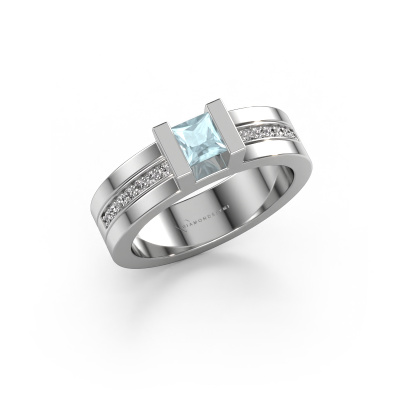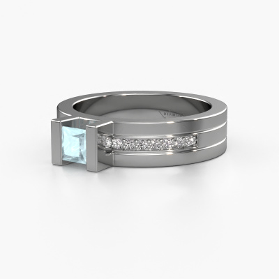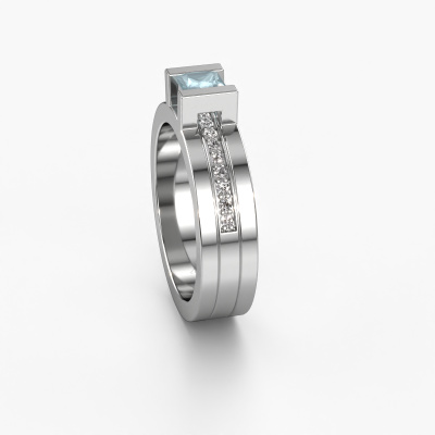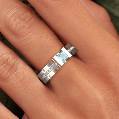 Der oben gezeigte Weißgold Verlobungsring wird Desire genannt. Es ist ein Pavé Solitär Ring, da er einen zentralen Edelstein und ein Band mit Pavé-Fassung hat. Der moderne Pavé Solitär Verlobungsring ist in der Kombination 14 Karat Weißgold mit Weißgold und ist mit einem princess 4 mm Aquamarin-Mittelstein besetzt und das Band hat eine Pavé-Fassung mit Diamanten. Jedes Schmuckstück wird von unseren Meister-Goldschmieden in unserem eigenen Studio für Sie gefertigt. Um den zentralen Stein noch mehr zu betonen, hat das Band eine Pavé-Fassung mit weiteren Aquamarin. Durch die offenen Krappen kann das Licht aus mehreren Winkeln auf den Aquamarin treffen und der Aquamarin-Ring funkelt noch mehr. Das obere Foto zeigt die leidenschaftlich handgefertigten Details des Rings. Die hohe Positionierung der Mittelstein ist ein echter Blickfang. Der perfekte Verlobungsring für das Kronjuwel Ihres Lebens!Durch die Kombination modernster Technik mit uralter Handwerkskunst können wir alle Verlobungsringe in unserem eigenen Studio anfertigen. Jedes Schmuckstück wird auf Anfrage gefertigt. Das ist vorteilhaft, weil wir Ihnen dadurch einen Preis anbieten können, den Sie nirgendwo anders finden.Haben Sie irgendwo einen bestimmten Verlobungsring gefunden, den Sie Ihrem Liebsten schenken möchten? Sie können uns gerne sagen, was Sie wollen und wir werden Ihr Design in einen Einzigartigen moderne Verlobungsring verwandeln. Sie können die Entwicklungen Ihres Ringdesigns verfolgen, da wir 3D-Zeichnungen verwenden. Das gibt Ihnen eine realistische Vorschau, wie Ihr Design aussehen wird. Sie können auch einen Dummy vorbestellen. Ein Dummy ist ein Kunststoffring, der nach Ihrem Ringdesign gestaltet werden kann. Sie können ihn anprobieren und prüfen, ob seine Breite und Größe für Sie geeignet sind. Wir senden Ihnen gerne ein unverbindliches Angebot zu einem fairen Preis/Leistungsverhältnis. Sie werden in Anbetracht der Qualität des Rings und der Edelsteine überrascht sein.Um es einfacher zu machen, bieten wir eine kostenlose 30-tägige Rücksendung.