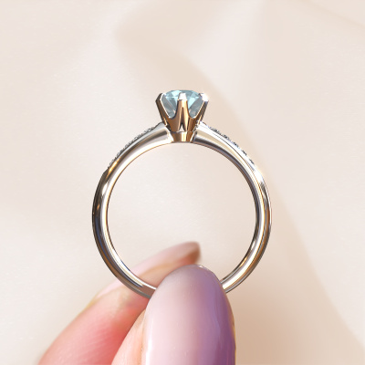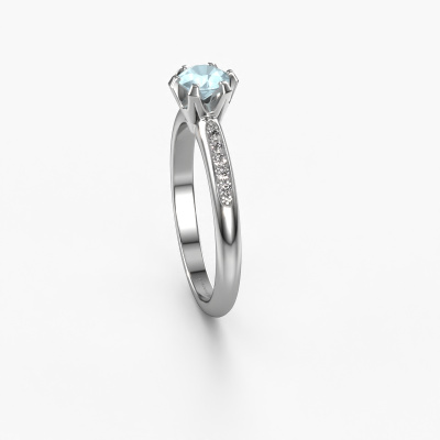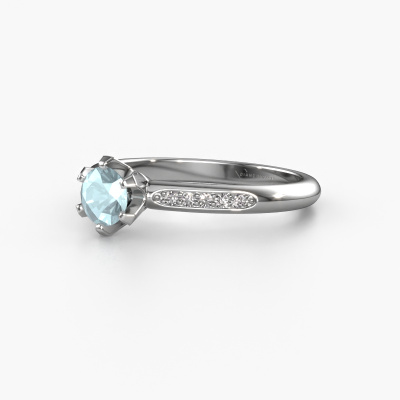 Der oben gezeigte Ring wird Tiffy 2 genannt. Es ist ein Pavé Solitär Ring, da er einen zentralen Edelstein und ein Band mit Pavé-Fassung hat. Dieser 14 Karat Weißgold ring ist mit einem 4.7 mm rund Aquamarin-Mittelstein besetzt und das Band hat eine Pavé-Fassung mit Diamanten. Jedes Schmuckstück ist um Ihrem Finger Glanz zu verleihen. Jeder Ring wird von unseren Goldschmieden liebevoll von Hand gefertigt.Dieser traditionell Weißgold Pavé Solitär Verlobungsring mit Pavé-Fassung hat einen exquisiten, rund Aquamarin als Mittelstein. Um den zentralen Stein noch mehr zu betonen, hat das Band eine Pavé-Fassung mit weiteren Diamanten. Durch die offenen Krappen kann das Licht aus mehreren Winkeln auf den Aquamarin treffen und der Aquamarin-Ring funkelt noch mehr. Das obere Foto zeigt die leidenschaftlich handgefertigten Details des Rings. Die hohe Positionierung der Mittelstein ist ein echter Blickfang. Der perfekte Verlobungsring für das Kronjuwel Ihres Lebens!Mit unserer modernen Technik können wir Schmuckstücke von höchster Qualität mit größter Sorgfalt für Sie entwerfen und anpassen. Unsere Verlobungsringe sind immer um 30 Prozent günstiger als bei anderen Juwelieren. Wir fertigen Verlobungsringe auf Bestellung, also müssen wir keine großen Lager unterhalten. Wenn Sie ein bestimmtes Budget haben, beraten wir Sie gerne entsprechend.Unsere Designer und Goldschmiede arbeiten jeden Tag zusammen und versuchen, neue Schmuckstücke zu kreieren. Vielleicht haben Sie irgendwo einen schönen, traditionell Verlobungsring gefunden, nach dem Ihr einzigartiger Ring gestaltet werden kann. Setzen Sie sich mit uns in Verbindung. Wir machen Ihnen ein Angebot, basierend auf einem fairen Preis/Leistungsverhältnis, das Sie begeistern wird.Um es einfacher zu machen, bieten wir eine kostenlose 30-tägige Rücksendung.
