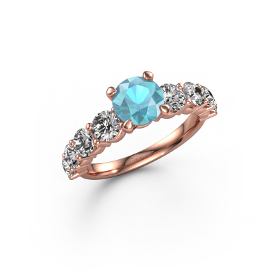 Der oben gezeigte Ring wird Deja genannt. Es ist ein Pavé Solitär Ring, da er einen zentralen Edelstein und ein Band mit Pavé-Fassung hat. Dieser 14 Karat Roségold ring ist mit einem 6.5 mm rund Blau Topas-Mittelstein besetzt und das Band hat eine Pavé-Fassung mit Lab grown Diamant. Jedes Schmuckstück wird von unseren Meister-Goldschmieden in unserem eigenen Studio für Sie gefertigt.Dieser exklusive Roségold Pavé Solitär Verlobungsring mit Pavé-Fassung hat einen exquisiten, rund Blau Topas als Mittelstein. Um den zentralen Stein noch mehr zu betonen, hat das Band eine Pavé-Fassung mit weiteren Lab grown Diamant. Durch die offenen Krappen kann das Licht aus mehreren Winkeln auf den Blau Topas treffen und der Blau Topas-Ring funkelt noch mehr. Das obere Foto zeigt die leidenschaftlich handgefertigten Details des Rings. Die hohe Positionierung der Mittelstein ist ein echter Blickfang. Der perfekte Verlobungsring für das Kronjuwel Ihres Lebens!Durch die Kombination modernster Technik mit uralter Handwerkskunst können wir alle Verlobungsringe in unserem eigenen Studio anfertigen. Jedes Schmuckstück wird auf Anfrage gefertigt. Das ist vorteilhaft, weil wir Ihnen dadurch einen Preis anbieten können, den Sie nirgendwo anders finden.Unser Team fügt unserer Online-Kollektion täglich neue Designs hinzu. Unsere Designer und Goldschmiede arbeiten zusammen, um das beste Design zu kreieren. Wir bemühen uns, eine vielfältige Kollektion von Schmuckstücken anzubieten. Vielleicht haben Sie ein bestimmtes Design im Sinn. Eines, dass Sie irgendwo gesehen haben. Gerne geben wir Ihnen eine kostenlose Beratung. Wir machen Ihnen ein Angebot, basierend auf einem fairen Preis/Leistungsverhältnis, das Sie verblüffen wird.Um es einfacher zu machen, bieten wir eine kostenlose 30-tägige Rücksendung.