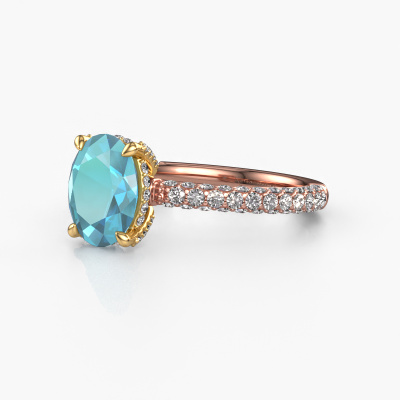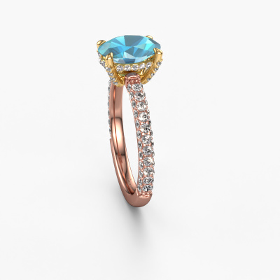 Der oben gezeigte Roségold Verlobungsring wird Saskia 2 ovl genannt. Es ist ein Pavé Solitär Ring, da er einen zentralen Edelstein und ein Band mit Pavé-Fassung hat. Der exklusive Pavé Solitär Verlobungsring ist in der Kombination 14 Karat Roségold mit Gold und ist mit einem oval 9x7 mm Blau Topas-Mittelstein besetzt und das Band hat eine Pavé-Fassung mit Lab grown Diamant. Jedes Schmuckstück wird von unseren Meister-Goldschmieden in unserem eigenen Studio für Sie gefertigt. Um den zentralen Stein noch mehr zu betonen, hat das Band eine Pavé-Fassung mit weiteren Blau Topas. Durch die offenen Krappen kann das Licht aus mehreren Winkeln auf den Blau Topas treffen und der Blau Topas-Ring funkelt noch mehr. Das obere Foto zeigt die leidenschaftlich handgefertigten Details des Rings. Die hohe Positionierung der Mittelstein ist ein echter Blickfang. Der perfekte Verlobungsring für das Kronjuwel Ihres Lebens!Nach Erhalt Ihrer Bestellung beginnen unsere Goldschmiede mit Leidenschaft den kreativen Prozess und fertigen Ihren Verlobungsring in unserem eigenen Studio. Da wir keine großen Lager haben, werden diese Kosten nicht an Sie weitergegeben. Unsere Preisgestaltung ist der Beweis dafür! Wir bieten Schmuck zum niedrigsten Preis, garantiert.Haben Sie irgendwo einen bestimmten Verlobungsring gefunden, den Sie Ihrem Liebsten schenken möchten? Sie können uns gerne sagen, was Sie wollen und wir werden Ihr Design in einen Einzigartigen exklusive Verlobungsring verwandeln. Sie können die Entwicklungen Ihres Ringdesigns verfolgen, da wir 3D-Zeichnungen verwenden. Das gibt Ihnen eine realistische Vorschau, wie Ihr Design aussehen wird. Sie können auch einen Dummy vorbestellen. Ein Dummy ist ein Kunststoffring, der nach Ihrem Ringdesign gestaltet werden kann. Sie können ihn anprobieren und prüfen, ob seine Breite und Größe für Sie geeignet sind. Wir senden Ihnen gerne ein unverbindliches Angebot zu einem fairen Preis/Leistungsverhältnis. Sie werden in Anbetracht der Qualität des Rings und der Edelsteine überrascht sein.Um es einfacher zu machen, bieten wir eine kostenlose 30-tägige Rücksendung.