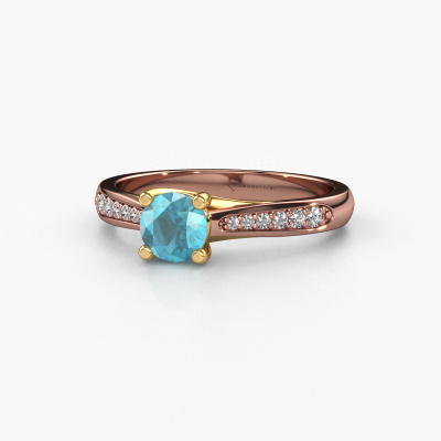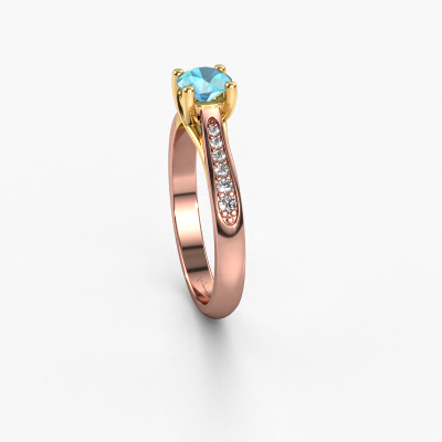 Der oben gezeigte Ring wird Mia 2 genannt. Es ist ein Pavé Solitär Ring, da er einen zentralen Edelstein und ein Band mit Pavé-Fassung hat. Dieser 14 Karat Roségold ring ist mit einem 5 mm rund Blau Topas-Mittelstein besetzt und das Band hat eine Pavé-Fassung mit Lab grown Diamant. Jedes Schmuckstück wird nur für Sie persönlich hergestellt, mit Liebe zum Detail und Design.Dieser moderne Roségold Pavé Solitär Verlobungsring mit Pavé-Fassung hat einen exquisiten, rund Blau Topas als Mittelstein. Um den zentralen Stein noch mehr zu betonen, hat das Band eine Pavé-Fassung mit weiteren Lab grown Diamant. Durch die offenen Krappen kann das Licht aus mehreren Winkeln auf den Blau Topas treffen und der Blau Topas-Ring funkelt noch mehr. Das obere Foto zeigt die leidenschaftlich handgefertigten Details des Rings. Die hohe Positionierung der Mittelstein ist ein echter Blickfang. Der perfekte Verlobungsring für das Kronjuwel Ihres Lebens!Mit unserer modernen Technik können wir Schmuckstücke von höchster Qualität mit größter Sorgfalt für Sie entwerfen und anpassen. Unsere Verlobungsringe sind immer um 30 Prozent günstiger als bei anderen Juwelieren. Wir fertigen Verlobungsringe auf Bestellung, also müssen wir keine großen Lager unterhalten. Wenn Sie ein bestimmtes Budget haben, beraten wir Sie gerne entsprechend.Verschiedene Arten von neuen Ringen werden täglich von unserem Team angefertigt. Vielleicht haben Sie irgendwo einen Pavé Solitär Verlobungsring gefunden. Einen, den Sie Ihrem Liebsten schenken möchten. Bitte zögern Sie nicht, unseren Schmuckdesignern Ihre Gedanken und Ihr Design zu zeigen. Wir würden gerne Ihr Design in einen moderne Verlobungsring verwandeln. Sie können die Entwicklungen Ihres Ringdesigns verfolgen, da wir sehr detaillierte 3D-Zeichnungen verwenden. Darüber hinaus können Sie einen Dummy des Designs bestellen. Ein Dummy ist ein Kunststoffring, der nach Ihrem Ringdesign gestaltet werden kann. Sie können ihn anprobieren und prüfen, ob der Verlobungsring Ihren Vorstellungen entspricht. Wir senden Ihnen gerne ein unverbindliches Angebot zu einem fairen Preis/Leistungsverhältnis. Das Angebot wird Sie angesichts der Qualität des Rings und der Edelsteine verblüffen.Um es einfacher zu machen, bieten wir eine kostenlose 30-tägige Rücksendung.