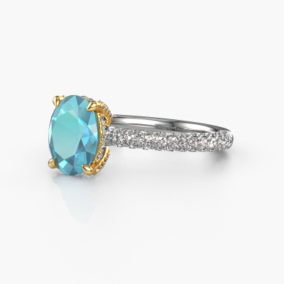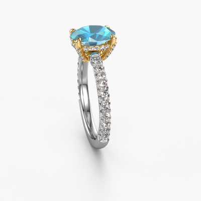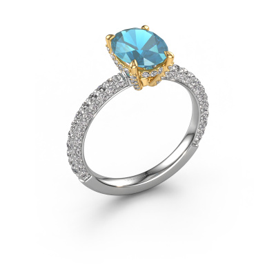 Der oben gezeigte Weißgold Verlobungsring wird Saskia 2 ovl genannt. Es ist ein Pavé Solitär Ring, da er einen zentralen Edelstein und ein Band mit Pavé-Fassung hat. Der exklusive Pavé Solitär Verlobungsring ist in der Kombination 14 Karat Weißgold mit Gold und ist mit einem oval 9x7 mm Blau Topas-Mittelstein besetzt und das Band hat eine Pavé-Fassung mit Lab grown Diamant. Jedes Schmuckstück wird von unseren Meister-Goldschmieden in unserem eigenen Studio für Sie gefertigt. Um den zentralen Stein noch mehr zu betonen, hat das Band eine Pavé-Fassung mit weiteren Blau Topas. Durch die offenen Krappen kann das Licht aus mehreren Winkeln auf den Blau Topas treffen und der Blau Topas-Ring funkelt noch mehr. Das obere Foto zeigt die leidenschaftlich handgefertigten Details des Rings. Die hohe Positionierung der Mittelstein ist ein echter Blickfang. Der perfekte Verlobungsring für das Kronjuwel Ihres Lebens!Nach Erhalt Ihrer Bestellung beginnen unsere Goldschmiede mit Leidenschaft den kreativen Prozess und fertigen Ihren Verlobungsring in unserem eigenen Studio. Da wir keine großen Lager haben, werden diese Kosten nicht an Sie weitergegeben. Unsere Preisgestaltung ist der Beweis dafür! Wir bieten Schmuck zum niedrigsten Preis, garantiert.Haben Sie irgendwo einen bestimmten Verlobungsring gefunden, den Sie Ihrem Liebsten schenken möchten? Sie können uns gerne sagen, was Sie wollen und wir werden Ihr Design in einen Einzigartigen exklusive Verlobungsring verwandeln. Sie können die Entwicklungen Ihres Ringdesigns verfolgen, da wir 3D-Zeichnungen verwenden. Das gibt Ihnen eine realistische Vorschau, wie Ihr Design aussehen wird. Sie können auch einen Dummy vorbestellen. Ein Dummy ist ein Kunststoffring, der nach Ihrem Ringdesign gestaltet werden kann. Sie können ihn anprobieren und prüfen, ob seine Breite und Größe für Sie geeignet sind. Wir senden Ihnen gerne ein unverbindliches Angebot zu einem fairen Preis/Leistungsverhältnis. Sie werden in Anbetracht der Qualität des Rings und der Edelsteine überrascht sein.Um es einfacher zu machen, bieten wir eine kostenlose 30-tägige Rücksendung.