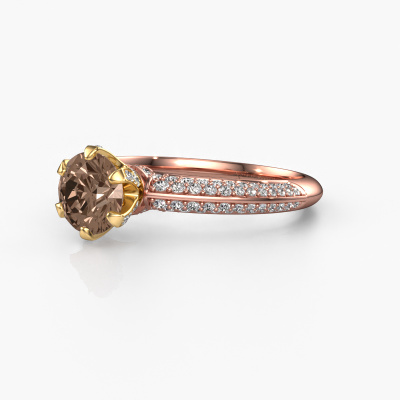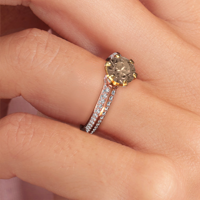 Der oben gezeigte Roségold Verlobungsring wird Abby genannt. Es ist ein Pavé Solitär Ring, da er einen zentralen Edelstein und ein Band mit Pavé-Fassung hat. Der exklusive Pavé Solitär Verlobungsring ist in der Kombination 14 Karat Roségold mit Gold und ist mit einem rund 1.00 crt Braun Diamant-Mittelstein besetzt und das Band hat eine Pavé-Fassung mit Diamanten. Jedes Schmuckstück wird von unseren Meister-Goldschmieden in unserem eigenen Studio für Sie gefertigt. Um den zentralen Stein noch mehr zu betonen, hat das Band eine Pavé-Fassung mit weiteren Braun Diamant. Durch die offenen Krappen kann das Licht aus mehreren Winkeln auf den Braun Diamant treffen und der Braun Diamant-Ring funkelt noch mehr. Das obere Foto zeigt die leidenschaftlich handgefertigten Details des Rings. Die hohe Positionierung der Mittelstein ist ein echter Blickfang. Der perfekte Verlobungsring für das Kronjuwel Ihres Lebens!Haben Sie ein bestimmtes Budget? Sie können uns gerne kontaktieren, damit wir Ihre Optionen besprechen können. Wir bieten unsere Verlobungsringe zum garantiert besten Preis, denn wir fertigen sie auf Bestellung. Solche Preise finden Sie nirgendwo anders!Unser Team fügt unserer Online-Kollektion täglich neue Designs hinzu. Unsere Designer und Goldschmiede arbeiten zusammen, um das beste Design zu kreieren. Wir bemühen uns, eine vielfältige Kollektion von Schmuckstücken anzubieten. Vielleicht haben Sie ein bestimmtes Design im Sinn. Eines, dass Sie irgendwo gesehen haben. Gerne geben wir Ihnen eine kostenlose Beratung. Wir machen Ihnen ein Angebot, basierend auf einem fairen Preis/Leistungsverhältnis, das Sie verblüffen wird.Um es einfacher zu machen, bieten wir eine kostenlose 30-tägige Rücksendung.