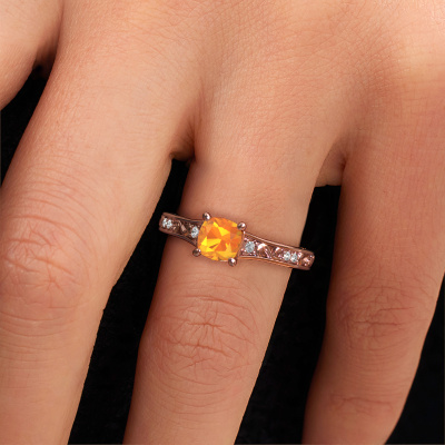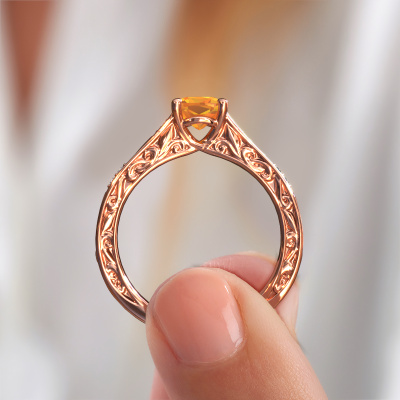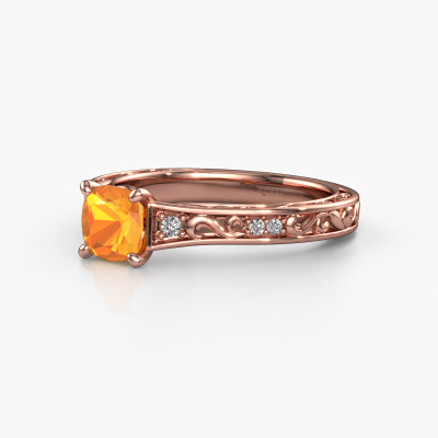 Der oben gezeigte Ring wird Mallory cus genannt. Es ist ein Pavé Solitär Ring, da er einen zentralen Edelstein und ein Band mit Pavé-Fassung hat. Dieser 14 Karat Roségold ring ist mit einem 5.5 mm cussion Citrin-Mittelstein besetzt und das Band hat eine Pavé-Fassung mit Diamanten. Jedes Schmuckstück wird von unseren Meister-Goldschmieden in unserem eigenen Studio für Sie gefertigt.Dieser Keltische Roségold Pavé Solitär Verlobungsring mit Pavé-Fassung hat einen exquisiten, cussion Citrin als Mittelstein. Um den zentralen Stein noch mehr zu betonen, hat das Band eine Pavé-Fassung mit weiteren Diamanten. Durch die offenen Krappen kann das Licht aus mehreren Winkeln auf den Citrin treffen und der Citrin-Ring funkelt noch mehr. Das obere Foto zeigt die leidenschaftlich handgefertigten Details des Rings. Die hohe Positionierung der Mittelstein ist ein echter Blickfang. Der perfekte Verlobungsring für das Kronjuwel Ihres Lebens!Mit unserer modernen Technik können wir Schmuckstücke von höchster Qualität mit größter Sorgfalt für Sie entwerfen und anpassen. Unsere Verlobungsringe sind immer um 30 Prozent günstiger als bei anderen Juwelieren. Wir fertigen Verlobungsringe auf Bestellung, also müssen wir keine großen Lager unterhalten. Wenn Sie ein bestimmtes Budget haben, beraten wir Sie gerne entsprechend.Verschiedene Arten von neuen Ringen werden täglich von unserem Team angefertigt. Vielleicht haben Sie irgendwo einen Pavé Solitär Verlobungsring gefunden. Einen, den Sie Ihrem Liebsten schenken möchten. Bitte zögern Sie nicht, unseren Schmuckdesignern Ihre Gedanken und Ihr Design zu zeigen. Wir würden gerne Ihr Design in einen Keltische Verlobungsring verwandeln. Sie können die Entwicklungen Ihres Ringdesigns verfolgen, da wir sehr detaillierte 3D-Zeichnungen verwenden. Darüber hinaus können Sie einen Dummy des Designs bestellen. Ein Dummy ist ein Kunststoffring, der nach Ihrem Ringdesign gestaltet werden kann. Sie können ihn anprobieren und prüfen, ob der Verlobungsring Ihren Vorstellungen entspricht. Wir senden Ihnen gerne ein unverbindliches Angebot zu einem fairen Preis/Leistungsverhältnis. Das Angebot wird Sie angesichts der Qualität des Rings und der Edelsteine verblüffen.Um es einfacher zu machen, bieten wir eine kostenlose 30-tägige Rücksendung.