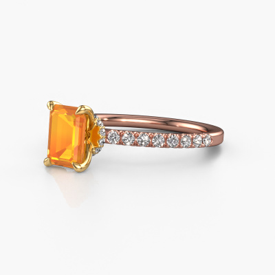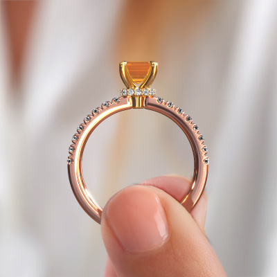 Der oben gezeigte Roségold Verlobungsring wird Crystal EME 4 genannt. Es ist ein Pavé Solitär Ring, da er einen zentralen Edelstein und ein Band mit Pavé-Fassung hat. Der modische Pavé Solitär Verlobungsring ist in der Kombination 14 Karat Roségold mit Gold und ist mit einem smaragd schliff 7x5 mm Citrin-Mittelstein besetzt und das Band hat eine Pavé-Fassung mit Lab grown Diamant. Jedes Schmuckstück ist um Ihrem Finger Glanz zu verleihen. Jeder Ring wird von unseren Goldschmieden liebevoll von Hand gefertigt. Um den zentralen Stein noch mehr zu betonen, hat das Band eine Pavé-Fassung mit weiteren Citrin. Durch die offenen Krappen kann das Licht aus mehreren Winkeln auf den Citrin treffen und der Citrin-Ring funkelt noch mehr. Das obere Foto zeigt die leidenschaftlich handgefertigten Details des Rings. Die hohe Positionierung der Mittelstein ist ein echter Blickfang. Der perfekte Verlobungsring für das Kronjuwel Ihres Lebens!Nach Erhalt Ihrer Bestellung beginnen unsere Goldschmiede mit Leidenschaft den kreativen Prozess und fertigen Ihren Verlobungsring in unserem eigenen Studio. Da wir keine großen Lager haben, werden diese Kosten nicht an Sie weitergegeben. Unsere Preisgestaltung ist der Beweis dafür! Wir bieten Schmuck zum niedrigsten Preis, garantiert.Unser Team fügt unserer Online-Kollektion täglich neue Designs hinzu. Unsere Designer und Goldschmiede arbeiten zusammen, um das beste Design zu kreieren. Wir bemühen uns, eine vielfältige Kollektion von Schmuckstücken anzubieten. Vielleicht haben Sie ein bestimmtes Design im Sinn. Eines, dass Sie irgendwo gesehen haben. Gerne geben wir Ihnen eine kostenlose Beratung. Wir machen Ihnen ein Angebot, basierend auf einem fairen Preis/Leistungsverhältnis, das Sie verblüffen wird.Um es einfacher zu machen, bieten wir eine kostenlose 30-tägige Rücksendung.