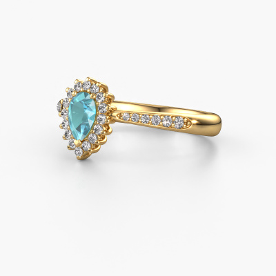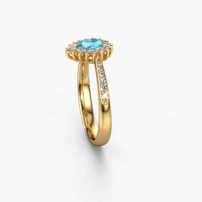 Der oben gezeigte Ring, mit dem Namen Tilly per 2, nennen wir einen Cluster Verlobungsring. Der Cluster Ring trägt einem zentralen Edelstein, umgeben von kleineren Steinen. Diese Version in 14 Karat Gold hat einen tropfen Blau Topas von tropfen als Mittelstein, umschlossen von kleineren Diamanten. Was diesen exklusive Gold Cluster Ring besonders macht, sind die kleinen Edelsteine rund um den zentralen Blau Topas, die wie eine schöne Blume geformt sind. Der umgebende Steinkranz umrahmt den Mittelstein so, dass er größer erscheint. Diese Art von Verlobungsring wird auch Blumen- oder Rosettenring genannt. Es ist sehr wichtig, dass die kleineren Blaue Topas identisch positioniert sind, so dass es kein Spiel im Licht, sondern eine perfekte Einheit ergibt. Unsere erfahrenen Juweliere erledigen diese Arbeit. Jeder einzelne Stein wird sorgfältig von Hand gesetzt. Während der Herstellung wird der Lichteinfall ständig überwacht, um sicherzustellen, dass der spezielle Cluster-Effekt noch sichtbar ist. Am Ende bekommen Sie den perfekten Verlobungsring mit einem strahlenden Blau Topas Edelstein Herzstück. Sie können sich die Wirkung eines solchen Ringes vorstellen, wenn Sie ihn an ihrem besonderen Tag für die Liebe Ihres Lebens zum Leuchten bringen. Jedes Schmuckstück wird nur für Sie persönlich hergestellt, mit Liebe zum Detail und Design.Nach Erhalt Ihrer Bestellung beginnen unsere Goldschmiede mit Leidenschaft den kreativen Prozess und fertigen Ihren Verlobungsring in unserem eigenen Studio. Da wir keine großen Lager haben, werden diese Kosten nicht an Sie weitergegeben. Unsere Preisgestaltung ist der Beweis dafür! Wir bieten Schmuck zum niedrigsten Preis, garantiert.Verschiedene Arten von neuen Ringen werden täglich von unserem Team angefertigt. Vielleicht haben Sie irgendwo einen Cluster Verlobungsring gefunden. Einen, den Sie Ihrem Liebsten schenken möchten. Bitte zögern Sie nicht, unseren Schmuckdesignern Ihre Gedanken und Ihr Design zu zeigen. Wir würden gerne Ihr Design in einen exklusive Verlobungsring verwandeln. Sie können die Entwicklungen Ihres Ringdesigns verfolgen, da wir sehr detaillierte 3D-Zeichnungen verwenden. Darüber hinaus können Sie einen Dummy des Designs bestellen. Ein Dummy ist ein Kunststoffring, der nach Ihrem Ringdesign gestaltet werden kann. Sie können ihn anprobieren und prüfen, ob der Verlobungsring Ihren Vorstellungen entspricht. Wir senden Ihnen gerne ein unverbindliches Angebot zu einem fairen Preis/Leistungsverhältnis. Das Angebot wird Sie angesichts der Qualität des Rings und der Edelsteine verblüffen.Um es einfacher zu machen, bieten wir eine kostenlose 30-tägige Rücksendung.