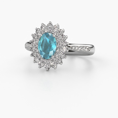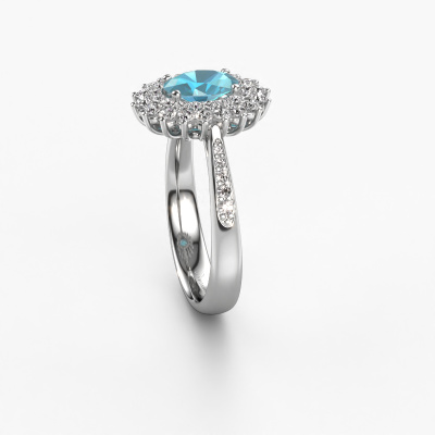 Der oben gezeigte Ring, mit dem Namen Alina 2, nennen wir einen Cluster Verlobungsring. Der Cluster Ring trägt einem zentralen Edelstein, umgeben von kleineren Steinen. Diese Version in 14 Karat Weißgold hat einen oval Blau Topas von oval als Mittelstein, umschlossen von kleineren Diamanten. Was diesen exklusive Weißgold Cluster Ring besonders macht, sind die kleinen Edelsteine rund um den zentralen Blau Topas, die wie eine schöne Blume geformt sind. Der umgebende Steinkranz umrahmt den Mittelstein so, dass er größer erscheint. Diese Art von Verlobungsring wird auch Blumen- oder Rosettenring genannt. Es ist sehr wichtig, dass die kleineren Blaue Topas identisch positioniert sind, so dass es kein Spiel im Licht, sondern eine perfekte Einheit ergibt. Unsere erfahrenen Juweliere erledigen diese Arbeit. Jeder einzelne Stein wird sorgfältig von Hand gesetzt. Während der Herstellung wird der Lichteinfall ständig überwacht, um sicherzustellen, dass der spezielle Cluster-Effekt noch sichtbar ist. Am Ende bekommen Sie den perfekten Verlobungsring mit einem strahlenden Blau Topas Edelstein Herzstück. Sie können sich die Wirkung eines solchen Ringes vorstellen, wenn Sie ihn an ihrem besonderen Tag für die Liebe Ihres Lebens zum Leuchten bringen. Jedes Schmuckstück wird nur für Sie persönlich hergestellt, mit Liebe zum Detail und Design.Durch die Kombination modernster Technik mit uralter Handwerkskunst können wir alle Verlobungsringe in unserem eigenen Studio anfertigen. Jedes Schmuckstück wird auf Anfrage gefertigt. Das ist vorteilhaft, weil wir Ihnen dadurch einen Preis anbieten können, den Sie nirgendwo anders finden.Haben Sie irgendwo einen bestimmten Verlobungsring gefunden, den Sie Ihrem Liebsten schenken möchten? Sie können uns gerne sagen, was Sie wollen und wir werden Ihr Design in einen Einzigartigen exklusive Verlobungsring verwandeln. Sie können die Entwicklungen Ihres Ringdesigns verfolgen, da wir 3D-Zeichnungen verwenden. Das gibt Ihnen eine realistische Vorschau, wie Ihr Design aussehen wird. Sie können auch einen Dummy vorbestellen. Ein Dummy ist ein Kunststoffring, der nach Ihrem Ringdesign gestaltet werden kann. Sie können ihn anprobieren und prüfen, ob seine Breite und Größe für Sie geeignet sind. Wir senden Ihnen gerne ein unverbindliches Angebot zu einem fairen Preis/Leistungsverhältnis. Sie werden in Anbetracht der Qualität des Rings und der Edelsteine überrascht sein.Um es einfacher zu machen, bieten wir eine kostenlose 30-tägige Rücksendung.
