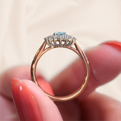 Der oben gezeigte Ring, mit dem Namen Alina 2, nennen wir einen Cluster Verlobungsring. Der Cluster Ring trägt einem zentralen Edelstein, umgeben von kleineren Steinen. Diese Version in 14 Karat Roségold hat einen oval blauer Labordiamant von oval als Mittelstein, umschlossen von kleineren Diamanten. Was diesen exklusive Roségold Cluster Ring besonders macht, sind die kleinen Edelsteine rund um den zentralen blauer Labordiamant, die wie eine schöne Blume geformt sind. Der umgebende Steinkranz umrahmt den Mittelstein so, dass er größer erscheint. Diese Art von Verlobungsring wird auch Blumen- oder Rosettenring genannt. Es ist sehr wichtig, dass die kleineren blauer Labordiamanten identisch positioniert sind, so dass es kein Spiel im Licht, sondern eine perfekte Einheit ergibt. Unsere erfahrenen Juweliere erledigen diese Arbeit. Jeder einzelne Stein wird sorgfältig von Hand gesetzt. Während der Herstellung wird der Lichteinfall ständig überwacht, um sicherzustellen, dass der spezielle Cluster-Effekt noch sichtbar ist. Am Ende bekommen Sie den perfekten Verlobungsring mit einem strahlenden blauer Labordiamant Edelstein Herzstück. Sie können sich die Wirkung eines solchen Ringes vorstellen, wenn Sie ihn an ihrem besonderen Tag für die Liebe Ihres Lebens zum Leuchten bringen. Jedes Schmuckstück wird nur für Sie persönlich hergestellt, mit Liebe zum Detail und Design.Durch die Kombination modernster Technik mit uralter Handwerkskunst können wir alle Verlobungsringe in unserem eigenen Studio anfertigen. Jedes Schmuckstück wird auf Anfrage gefertigt. Das ist vorteilhaft, weil wir Ihnen dadurch einen Preis anbieten können, den Sie nirgendwo anders finden.Haben Sie irgendwo einen bestimmten Verlobungsring gefunden, den Sie Ihrem Liebsten schenken möchten? Sie können uns gerne sagen, was Sie wollen und wir werden Ihr Design in einen Einzigartigen exklusive Verlobungsring verwandeln. Sie können die Entwicklungen Ihres Ringdesigns verfolgen, da wir 3D-Zeichnungen verwenden. Das gibt Ihnen eine realistische Vorschau, wie Ihr Design aussehen wird. Sie können auch einen Dummy vorbestellen. Ein Dummy ist ein Kunststoffring, der nach Ihrem Ringdesign gestaltet werden kann. Sie können ihn anprobieren und prüfen, ob seine Breite und Größe für Sie geeignet sind. Wir senden Ihnen gerne ein unverbindliches Angebot zu einem fairen Preis/Leistungsverhältnis. Sie werden in Anbetracht der Qualität des Rings und der Edelsteine überrascht sein.Um es einfacher zu machen, bieten wir eine kostenlose 30-tägige Rücksendung.