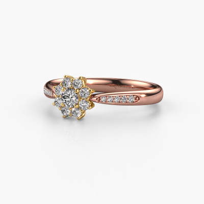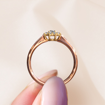 Der oben gezeigte Ring, mit dem Namen Carolyn 2, nennen wir einen Cluster Verlobungsring. Der Cluster Ring trägt einem zentralen Edelstein, umgeben von kleineren Steinen. Diese Version in 14 Karat Roségold hat einen rund Diamant von rund als Mittelstein, umschlossen von kleineren Diamanten. Was diesen traditionell Roségold Cluster Ring besonders macht, sind die kleinen Edelsteine rund um den zentralen Diamant, die wie eine schöne Blume geformt sind. Der umgebende Steinkranz umrahmt den Mittelstein so, dass er größer erscheint. Diese Art von Verlobungsring wird auch Blumen- oder Rosettenring genannt. Es ist sehr wichtig, dass die kleineren Diamanten identisch positioniert sind, so dass es kein Spiel im Licht, sondern eine perfekte Einheit ergibt. Unsere erfahrenen Juweliere erledigen diese Arbeit. Jeder einzelne Stein wird sorgfältig von Hand gesetzt. Während der Herstellung wird der Lichteinfall ständig überwacht, um sicherzustellen, dass der spezielle Cluster-Effekt noch sichtbar ist. Am Ende bekommen Sie den perfekten Verlobungsring mit einem strahlenden Diamant Edelstein Herzstück. Sie können sich die Wirkung eines solchen Ringes vorstellen, wenn Sie ihn an ihrem besonderen Tag für die Liebe Ihres Lebens zum Leuchten bringen. Jedes Schmuckstück ist einzigartig in jeder Hinsicht! Einfach nach Ihren Wünschen anzupassen.Haben Sie ein bestimmtes Budget? Sie können uns gerne kontaktieren, damit wir Ihre Optionen besprechen können. Wir bieten unsere Verlobungsringe zum garantiert besten Preis, denn wir fertigen sie auf Bestellung. Solche Preise finden Sie nirgendwo anders!Unser Team fügt unserer Online-Kollektion täglich neue Designs hinzu. Unsere Designer und Goldschmiede arbeiten zusammen, um das beste Design zu kreieren. Wir bemühen uns, eine vielfältige Kollektion von Schmuckstücken anzubieten. Vielleicht haben Sie ein bestimmtes Design im Sinn. Eines, dass Sie irgendwo gesehen haben. Gerne geben wir Ihnen eine kostenlose Beratung. Wir machen Ihnen ein Angebot, basierend auf einem fairen Preis/Leistungsverhältnis, das Sie verblüffen wird.Um es einfacher zu machen, bieten wir eine kostenlose 30-tägige Rücksendung.