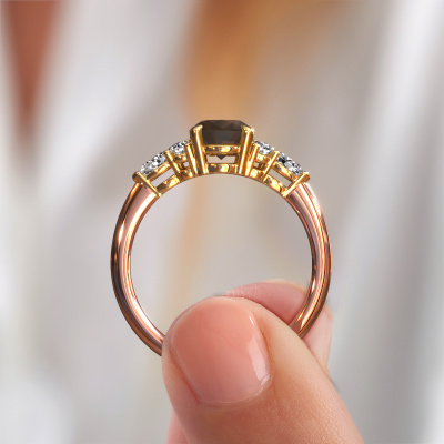 Dieser Ring aus 14 Karat Roségold heißt Melani OVL und hat 8x6 mm Rauchquarz. Dieser elegante 14 Karat Roségold Cluster Verlobungsring ist ein wahres Kunstwerk! Die Ornamente werden mit viel Geduld und großer Leidenschaft gefertigt. Um diesen Ring mit großer Präzision zu schaffen, erfordert dieses Handwerk ein scharfes Auge und eine geschickte Hand. Eine Herausforderung, die bei unseren erfahrenen Juwelieren ein Feuer entfacht. Die exquisiten Rauchquarz sind auf eine besondere Art und Weise gefasst, so dass sie noch mehr hervorstechen. Dies verleiht dem Ring eine noch glamourösere Erscheinung. Der Ring an sich ist schon wegen der Edelsteine einzigartig, die wir speziell für diesen Ring auswählen. Obendrein wählen Sie die Edelmetalle aus, mit denen Ihr einzigartiger Ring für die außergewöhnlichste Frau Ihres Lebens gemacht wird! Jedes Schmuckstück wird hergestellt von einem Team leidenschaftlicher Goldschmiede und Schmuckdesigner. Das wird Ihr Kronjuwel unbedingt zu einem Blickfang machen.Durch die Kombination modernster Technik mit uralter Handwerkskunst können wir alle Verlobungsringe in unserem eigenen Studio anfertigen. Jedes Schmuckstück wird auf Anfrage gefertigt. Das ist vorteilhaft, weil wir Ihnen dadurch einen Preis anbieten können, den Sie nirgendwo anders finden.Unsere Designer und Goldschmiede arbeiten jeden Tag zusammen und versuchen, neue Schmuckstücke zu kreieren. Vielleicht haben Sie irgendwo einen schönen, modische Verlobungsring gefunden, nach dem Ihr einzigartiger Ring gestaltet werden kann. Setzen Sie sich mit uns in Verbindung. Wir machen Ihnen ein Angebot, basierend auf einem fairen Preis/Leistungsverhältnis, das Sie begeistern wird.Um es einfacher zu machen, bieten wir eine kostenlose 30-tägige Rücksendung.