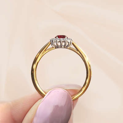 Der oben gezeigte Ring, mit dem Namen Tilly RND 1, nennen wir einen Cluster Verlobungsring. Der Cluster Ring trägt einem zentralen Edelstein, umgeben von kleineren Steinen. Diese Version in 14 Karat Gold hat einen rund Rubin von rund als Mittelstein, umschlossen von kleineren Diamanten. Was diesen klassische Gold Cluster Ring besonders macht, sind die kleinen Edelsteine rund um den zentralen Rubin, die wie eine schöne Blume geformt sind. Der umgebende Steinkranz umrahmt den Mittelstein so, dass er größer erscheint. Diese Art von Verlobungsring wird auch Blumen- oder Rosettenring genannt. Es ist sehr wichtig, dass die kleineren Rubin identisch positioniert sind, so dass es kein Spiel im Licht, sondern eine perfekte Einheit ergibt. Unsere erfahrenen Juweliere erledigen diese Arbeit. Jeder einzelne Stein wird sorgfältig von Hand gesetzt. Während der Herstellung wird der Lichteinfall ständig überwacht, um sicherzustellen, dass der spezielle Cluster-Effekt noch sichtbar ist. Am Ende bekommen Sie den perfekten Verlobungsring mit einem strahlenden Rubin Edelstein Herzstück. Sie können sich die Wirkung eines solchen Ringes vorstellen, wenn Sie ihn an ihrem besonderen Tag für die Liebe Ihres Lebens zum Leuchten bringen. Jedes Schmuckstück lässt Ihren Finger erstrahlen. Ihr Ring ist mit Liebe von unseren Goldschmieden handgefertigt.Durch die Kombination modernster Technik mit uralter Handwerkskunst können wir alle Verlobungsringe in unserem eigenen Studio anfertigen. Jedes Schmuckstück wird auf Anfrage gefertigt. Das ist vorteilhaft, weil wir Ihnen dadurch einen Preis anbieten können, den Sie nirgendwo anders finden.Unser Team fügt unserer Online-Kollektion täglich neue Designs hinzu. Unsere Designer und Goldschmiede arbeiten zusammen, um das beste Design zu kreieren. Wir bemühen uns, eine vielfältige Kollektion von Schmuckstücken anzubieten. Vielleicht haben Sie ein bestimmtes Design im Sinn. Eines, dass Sie irgendwo gesehen haben. Gerne geben wir Ihnen eine kostenlose Beratung. Wir machen Ihnen ein Angebot, basierend auf einem fairen Preis/Leistungsverhältnis, das Sie verblüffen wird.Um es einfacher zu machen, bieten wir eine kostenlose 30-tägige Rücksendung.