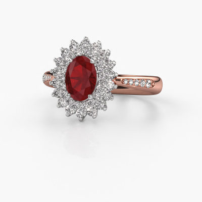 Der oben gezeigte Ring, mit dem Namen Alina 2, nennen wir einen Cluster Verlobungsring. Der Cluster Ring trägt einem zentralen Edelstein, umgeben von kleineren Steinen. Diese Version in 14 Karat Roségold hat einen oval Rubin von oval als Mittelstein, umschlossen von kleineren Diamanten. Was diesen exklusive Roségold Cluster Ring besonders macht, sind die kleinen Edelsteine rund um den zentralen Rubin, die wie eine schöne Blume geformt sind. Der umgebende Steinkranz umrahmt den Mittelstein so, dass er größer erscheint. Diese Art von Verlobungsring wird auch Blumen- oder Rosettenring genannt. Es ist sehr wichtig, dass die kleineren Rubin identisch positioniert sind, so dass es kein Spiel im Licht, sondern eine perfekte Einheit ergibt. Unsere erfahrenen Juweliere erledigen diese Arbeit. Jeder einzelne Stein wird sorgfältig von Hand gesetzt. Während der Herstellung wird der Lichteinfall ständig überwacht, um sicherzustellen, dass der spezielle Cluster-Effekt noch sichtbar ist. Am Ende bekommen Sie den perfekten Verlobungsring mit einem strahlenden Rubin Edelstein Herzstück. Sie können sich die Wirkung eines solchen Ringes vorstellen, wenn Sie ihn an ihrem besonderen Tag für die Liebe Ihres Lebens zum Leuchten bringen. Jedes Schmuckstück wird nur für Sie persönlich hergestellt, mit Liebe zum Detail und Design.Durch die Kombination modernster Technik mit uralter Handwerkskunst können wir alle Verlobungsringe in unserem eigenen Studio anfertigen. Jedes Schmuckstück wird auf Anfrage gefertigt. Das ist vorteilhaft, weil wir Ihnen dadurch einen Preis anbieten können, den Sie nirgendwo anders finden.Haben Sie irgendwo einen bestimmten Verlobungsring gefunden, den Sie Ihrem Liebsten schenken möchten? Sie können uns gerne sagen, was Sie wollen und wir werden Ihr Design in einen Einzigartigen exklusive Verlobungsring verwandeln. Sie können die Entwicklungen Ihres Ringdesigns verfolgen, da wir 3D-Zeichnungen verwenden. Das gibt Ihnen eine realistische Vorschau, wie Ihr Design aussehen wird. Sie können auch einen Dummy vorbestellen. Ein Dummy ist ein Kunststoffring, der nach Ihrem Ringdesign gestaltet werden kann. Sie können ihn anprobieren und prüfen, ob seine Breite und Größe für Sie geeignet sind. Wir senden Ihnen gerne ein unverbindliches Angebot zu einem fairen Preis/Leistungsverhältnis. Sie werden in Anbetracht der Qualität des Rings und der Edelsteine überrascht sein.Um es einfacher zu machen, bieten wir eine kostenlose 30-tägige Rücksendung.