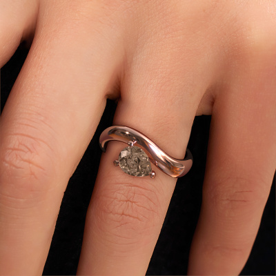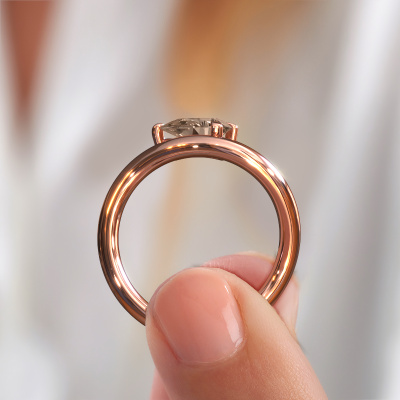 Der oben gezeigte Verlobungsring wird Chloe PER genannt. Wir nennen das einen Solitär-Ring, denn er hat einen einzelnen Edelstein. Es ist ein 14 Karat Roségold Verlobungsring, mit 1.00 crt tropfen Braun Diamant. Dieser außergewöhnliche, design