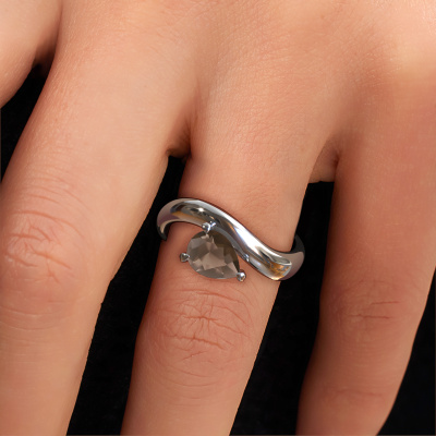 Der oben gezeigte Verlobungsring wird Chloe PER genannt. Wir nennen das einen Solitär-Ring, denn er hat einen einzelnen Edelstein. Es ist ein 14 Karat Weißgold Verlobungsring, mit 8x6 mm tropfen Rauchquarz. Dieser außergewöhnliche, design