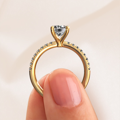 Der oben gezeigte Gold Verlobungsring wird Crystal RND 2 genannt. Es ist ein Pavé Solitär Ring, da er einen zentralen Edelstein und ein Band mit Pavé-Fassung hat. Der klassische Pavé Solitär Verlobungsring ist in der Kombination 14 Karat Gold mit Gold und ist mit einem rund 1.00 crt Diamant-Mittelstein besetzt und das Band hat eine Pavé-Fassung mit Lab grown Diamant. Jedes Schmuckstück ist einzigartig in jeder Hinsicht! Einfach nach Ihren Wünschen anzupassen. Um den zentralen Stein noch mehr zu betonen, hat das Band eine Pavé-Fassung mit weiteren Diamant. Durch die offenen Krappen kann das Licht aus mehreren Winkeln auf den Diamant treffen und der Diamant-Ring funkelt noch mehr. Das obere Foto zeigt die leidenschaftlich handgefertigten Details des Rings. Die hohe Positionierung der Mittelstein ist ein echter Blickfang. Der perfekte Verlobungsring für das Kronjuwel Ihres Lebens!Nachdem Sie Ihre Bestellung aufgegeben haben, beginnen unsere Goldschmiede mit dem kreativen Prozess der Herstellung Ihres Crystal RND 2 Verlobungsring. Wir haben keine Lager. Das ist vorteilhaft, da diese Kosten nicht an Sie weitergegeben werden. Daher sind wir in der Lage, Schmuck zu außergewöhnlich niedrigen Preisen anzubieten.Verschiedene Arten von neuen Ringen werden täglich von unserem Team angefertigt. Vielleicht haben Sie irgendwo einen Pavé Solitär Verlobungsring gefunden. Einen, den Sie Ihrem Liebsten schenken möchten. Bitte zögern Sie nicht, unseren Schmuckdesignern Ihre Gedanken und Ihr Design zu zeigen. Wir würden gerne Ihr Design in einen klassische Verlobungsring verwandeln. Sie können die Entwicklungen Ihres Ringdesigns verfolgen, da wir sehr detaillierte 3D-Zeichnungen verwenden. Darüber hinaus können Sie einen Dummy des Designs bestellen. Ein Dummy ist ein Kunststoffring, der nach Ihrem Ringdesign gestaltet werden kann. Sie können ihn anprobieren und prüfen, ob der Verlobungsring Ihren Vorstellungen entspricht. Wir senden Ihnen gerne ein unverbindliches Angebot zu einem fairen Preis/Leistungsverhältnis. Das Angebot wird Sie angesichts der Qualität des Rings und der Edelsteine verblüffen.Um es einfacher zu machen, bieten wir eine kostenlose 30-tägige Rücksendung.