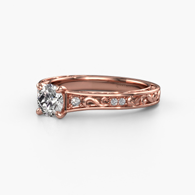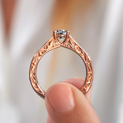 Der oben gezeigte Ring wird Mallory rnd genannt. Es ist ein Pavé Solitär Ring, da er einen zentralen Edelstein und ein Band mit Pavé-Fassung hat. Dieser 14 Karat Roségold ring ist mit einem 0.60 crt rund Diamant-Mittelstein besetzt und das Band hat eine Pavé-Fassung mit Lab grown Diamant. Jedes Schmuckstück wird von unseren Meister-Goldschmieden in unserem eigenen Studio für Sie gefertigt.Dieser Vintage Roségold Pavé Solitär Verlobungsring mit Pavé-Fassung hat einen exquisiten, rund Diamant als Mittelstein. Um den zentralen Stein noch mehr zu betonen, hat das Band eine Pavé-Fassung mit weiteren Lab grown Diamant. Durch die offenen Krappen kann das Licht aus mehreren Winkeln auf den Diamant treffen und der Diamant-Ring funkelt noch mehr. Das obere Foto zeigt die leidenschaftlich handgefertigten Details des Rings. Die hohe Positionierung der Mittelstein ist ein echter Blickfang. Der perfekte Verlobungsring für das Kronjuwel Ihres Lebens!Da wir unsere eigenen Ringe entwerfen und liefern, können wir Ihnen einen Verlobungsring zu einem Preis anbieten, den Sie nirgendwo anders finden. Ein Ring wird auf Bestellung angefertigt, wodurch kein überschüssiges Material anfällt. So können wir Ihnen ein gutes Angebot zum besten Preis machen. Wir verstehen, dass es sich riskant anfühlt, Ihren Verlobungsring online zu kaufen. Jedoch helfen wir Ihnen gerne beim Designprozess unter Berücksichtigung Ihres Budgets.Verschiedene Arten von neuen Ringen werden täglich von unserem Team angefertigt. Vielleicht haben Sie irgendwo einen Pavé Solitär Verlobungsring gefunden. Einen, den Sie Ihrem Liebsten schenken möchten. Bitte zögern Sie nicht, unseren Schmuckdesignern Ihre Gedanken und Ihr Design zu zeigen. Wir würden gerne Ihr Design in einen Vintage Verlobungsring verwandeln. Sie können die Entwicklungen Ihres Ringdesigns verfolgen, da wir sehr detaillierte 3D-Zeichnungen verwenden. Darüber hinaus können Sie einen Dummy des Designs bestellen. Ein Dummy ist ein Kunststoffring, der nach Ihrem Ringdesign gestaltet werden kann. Sie können ihn anprobieren und prüfen, ob der Verlobungsring Ihren Vorstellungen entspricht. Wir senden Ihnen gerne ein unverbindliches Angebot zu einem fairen Preis/Leistungsverhältnis. Das Angebot wird Sie angesichts der Qualität des Rings und der Edelsteine verblüffen.Um es einfacher zu machen, bieten wir eine kostenlose 30-tägige Rücksendung.