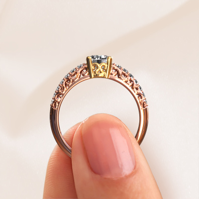 Dieser Verlobungsring aus 14 Karat Roségold mit 0.82 crt Diamant heißt Mellie. Was macht Ihre Beziehung einzigartig? Was hat sie an sich, was Sie dazu bringt, auf die Knie zu fallen? Die einzigartige Verbindung zwischen Ihnen beiden wird durch einen ebenso einzigartigen Ring unterstrichen. Ein einzigartiger Pavé Solitär Verlobungsring, der nur für sie gemacht wurde. Deshalb passt dieser Ring wie angegossen. Jedes einzelne Detail dieses Filigrane, Roségold Diamant Verlobungsring wird von unserem erfahrenen Goldschmieden in unserem eigenen Studio von Hand ausgesucht, bearbeitet und poliert. Das Endprodukt ist ein exquisiter Ring, einzigartig und bis zur Perfektion gebracht. Danach streben unsere erfahrenen Juweliere. Jedes Schmuckstück wird hergestellt von einem Team leidenschaftlicher Goldschmiede und Schmuckdesigner. Das wird Ihr Kronjuwel unbedingt zu einem Blickfang machen.Haben Sie ein bestimmtes Budget? Sie können uns gerne kontaktieren, damit wir Ihre Optionen besprechen können. Wir bieten unsere Verlobungsringe zum garantiert besten Preis, denn wir fertigen sie auf Bestellung. Solche Preise finden Sie nirgendwo anders!Haben Sie irgendwo einen bestimmten Verlobungsring gefunden, den Sie Ihrem Liebsten schenken möchten? Sie können uns gerne sagen, was Sie wollen und wir werden Ihr Design in einen Einzigartigen Vintage Verlobungsring verwandeln. Sie können die Entwicklungen Ihres Ringdesigns verfolgen, da wir 3D-Zeichnungen verwenden. Das gibt Ihnen eine realistische Vorschau, wie Ihr Design aussehen wird. Sie können auch einen Dummy vorbestellen. Ein Dummy ist ein Kunststoffring, der nach Ihrem Ringdesign gestaltet werden kann. Sie können ihn anprobieren und prüfen, ob seine Breite und Größe für Sie geeignet sind. Wir senden Ihnen gerne ein unverbindliches Angebot zu einem fairen Preis/Leistungsverhältnis. Sie werden in Anbetracht der Qualität des Rings und der Edelsteine überrascht sein.Um es einfacher zu machen, bieten wir eine kostenlose 30-tägige Rücksendung.