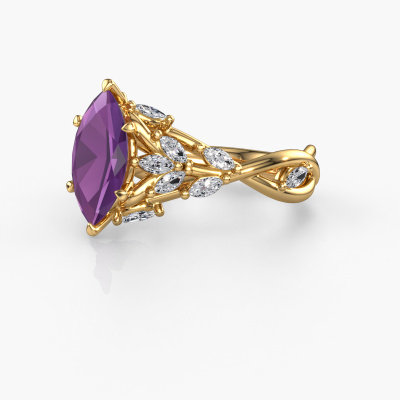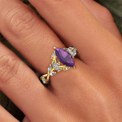 Dieser Ring aus 14 Karat Gold heißt Samantha MRQ und hat 11x5.5 mm Amethyst. Dieser graziöse 14 Karat Gold Flower Verlobungsring ist ein wahres Kunstwerk! Die Ornamente werden mit viel Geduld und großer Leidenschaft gefertigt. Um diesen Ring mit großer Präzision zu schaffen, erfordert dieses Handwerk ein scharfes Auge und eine geschickte Hand. Eine Herausforderung, die bei unseren erfahrenen Juwelieren ein Feuer entfacht. Die exquisiten Amethysten sind auf eine besondere Art und Weise gefasst, so dass sie noch mehr hervorstechen. Dies verleiht dem Ring eine noch glamourösere Erscheinung. Der Ring an sich ist schon wegen der Edelsteine einzigartig, die wir speziell für diesen Ring auswählen. Obendrein wählen Sie die Edelmetalle aus, mit denen Ihr einzigartiger Ring für die außergewöhnlichste Frau Ihres Lebens gemacht wird! Jedes Schmuckstück ist um Ihrem Finger Glanz zu verleihen. Jeder Ring wird von unseren Goldschmieden liebevoll von Hand gefertigt.Durch die Kombination modernster Technik mit uralter Handwerkskunst können wir alle Verlobungsringe in unserem eigenen Studio anfertigen. Jedes Schmuckstück wird auf Anfrage gefertigt. Das ist vorteilhaft, weil wir Ihnen dadurch einen Preis anbieten können, den Sie nirgendwo anders finden.Unser Team fügt unserer Online-Kollektion täglich neue Designs hinzu. Unsere Designer und Goldschmiede arbeiten zusammen, um das beste Design zu kreieren. Wir bemühen uns, eine vielfältige Kollektion von Schmuckstücken anzubieten. Vielleicht haben Sie ein bestimmtes Design im Sinn. Eines, dass Sie irgendwo gesehen haben. Gerne geben wir Ihnen eine kostenlose Beratung. Wir machen Ihnen ein Angebot, basierend auf einem fairen Preis/Leistungsverhältnis, das Sie verblüffen wird.Um es einfacher zu machen, bieten wir eine kostenlose 30-tägige Rücksendung.