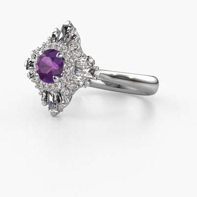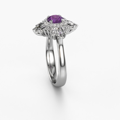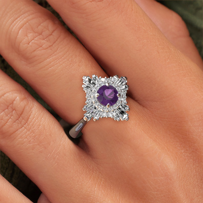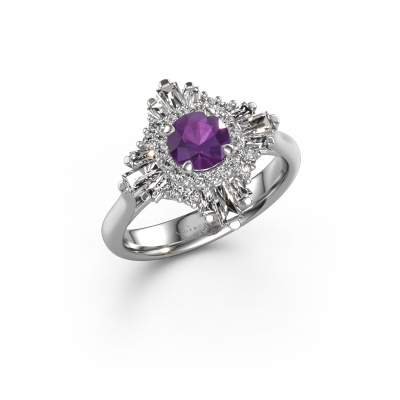 Dieser Verlobungsring aus 14 Karat Weißgold heißt Thalia und hat einen 5.4 mm Amethyst. Ein außergewöhnlicher, Weißgold Vintage Ring. Einer, der die Liebe Ihres Lebens mit Sicherheit wie ein Amethyst erstrahlen lässt! Das hoffen wir zu erreichen. Dieser Vintage Verlobungsring ist mit exquisiten Amethyst besetzt. Welchen Edelstein Sie aus unserer Auswahl haben möchten, liegt ganz bei Ihnen. Der Edelstein wird mit großer Sorgfalt ausgewählt. Denn wir glauben, dass Ihr besondere Verlobungsring nur mit dem schönsten Edelstein gekrönt sein darf. Sehen Sie das auch so? Unser erfahrener Juwelier entwirft Ihren Ring in unserem eigenen Studio, wo der Amethyst mit großer Präzision eingefasst wird. Der Ring wird dann bearbeitet und poliert, bis er perfekt ist. Nichts als das Beste für die Liebe Ihres Lebens! Jedes Schmuckstück wird hergestellt mit Leidenschaft und Liebe, von einem unserer Meister-Goldschmiede.Nach Erhalt Ihrer Bestellung beginnen unsere Goldschmiede mit Leidenschaft den kreativen Prozess und fertigen Ihren Verlobungsring in unserem eigenen Studio. Da wir keine großen Lager haben, werden diese Kosten nicht an Sie weitergegeben. Unsere Preisgestaltung ist der Beweis dafür! Wir bieten Schmuck zum niedrigsten Preis, garantiert.Haben Sie irgendwo einen bestimmten Verlobungsring gefunden, den Sie Ihrem Liebsten schenken möchten? Sie können uns gerne sagen, was Sie wollen und wir werden Ihr Design in einen Einzigartigen Vintage Verlobungsring verwandeln. Sie können die Entwicklungen Ihres Ringdesigns verfolgen, da wir 3D-Zeichnungen verwenden. Das gibt Ihnen eine realistische Vorschau, wie Ihr Design aussehen wird. Sie können auch einen Dummy vorbestellen. Ein Dummy ist ein Kunststoffring, der nach Ihrem Ringdesign gestaltet werden kann. Sie können ihn anprobieren und prüfen, ob seine Breite und Größe für Sie geeignet sind. Wir senden Ihnen gerne ein unverbindliches Angebot zu einem fairen Preis/Leistungsverhältnis. Sie werden in Anbetracht der Qualität des Rings und der Edelsteine überrascht sein.Um es einfacher zu machen, bieten wir eine kostenlose 30-tägige Rücksendung.