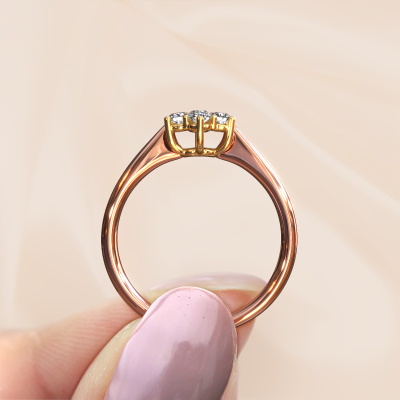 Der oben gezeigte Ring, mit dem Namen Chantal 1, nennen wir einen Flower Verlobungsring. Der Cluster Ring trägt einem zentralen Edelstein, umgeben von kleineren Steinen. Diese Version in 14 Karat Roségold hat einen rund Diamant von rund als Mittelstein, umschlossen von kleineren Diamanten. Was diesen traditionell Roségold Flower Ring besonders macht, sind die kleinen Edelsteine rund um den zentralen Diamant, die wie eine schöne Blume geformt sind. Der umgebende Steinkranz umrahmt den Mittelstein so, dass er größer erscheint. Diese Art von Verlobungsring wird auch Blumen- oder Rosettenring genannt. Es ist sehr wichtig, dass die kleineren Diamanten identisch positioniert sind, so dass es kein Spiel im Licht, sondern eine perfekte Einheit ergibt. Unsere erfahrenen Juweliere erledigen diese Arbeit. Jeder einzelne Stein wird sorgfältig von Hand gesetzt. Während der Herstellung wird der Lichteinfall ständig überwacht, um sicherzustellen, dass der spezielle Flower-Effekt noch sichtbar ist. Am Ende bekommen Sie den perfekten Verlobungsring mit einem strahlenden Diamant Edelstein Herzstück. Sie können sich die Wirkung eines solchen Ringes vorstellen, wenn Sie ihn an ihrem besonderen Tag für die Liebe Ihres Lebens zum Leuchten bringen. Jedes Schmuckstück ist einzigartig in jeder Hinsicht! Einfach nach Ihren Wünschen anzupassen.Mit unserer modernen Technik können wir Schmuckstücke von höchster Qualität mit größter Sorgfalt für Sie entwerfen und anpassen. Unsere Verlobungsringe sind immer um 30 Prozent günstiger als bei anderen Juwelieren. Wir fertigen Verlobungsringe auf Bestellung, also müssen wir keine großen Lager unterhalten. Wenn Sie ein bestimmtes Budget haben, beraten wir Sie gerne entsprechend.Unsere Designer und Goldschmiede arbeiten jeden Tag zusammen und versuchen, neue Schmuckstücke zu kreieren. Vielleicht haben Sie irgendwo einen schönen, traditionell Verlobungsring gefunden, nach dem Ihr einzigartiger Ring gestaltet werden kann. Setzen Sie sich mit uns in Verbindung. Wir machen Ihnen ein Angebot, basierend auf einem fairen Preis/Leistungsverhältnis, das Sie begeistern wird.Um es einfacher zu machen, bieten wir eine kostenlose 30-tägige Rücksendung.