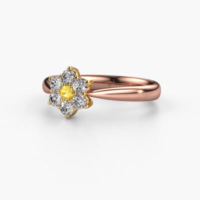Der oben gezeigte Ring, mit dem Namen Chantal 1, nennen wir einen Flower Verlobungsring. Der Cluster Ring trägt einem zentralen Edelstein, umgeben von kleineren Steinen. Diese Version in 14 Karat Roségold hat einen rund Gelb Saphir von rund als Mittelstein, umschlossen von kleineren Diamanten. Was diesen traditionell Roségold Flower Ring besonders macht, sind die kleinen Edelsteine rund um den zentralen Gelb Saphir, die wie eine schöne Blume geformt sind. Der umgebende Steinkranz umrahmt den Mittelstein so, dass er größer erscheint. Diese Art von Verlobungsring wird auch Blumen- oder Rosettenring genannt. Es ist sehr wichtig, dass die kleineren Gelb Saphir identisch positioniert sind, so dass es kein Spiel im Licht, sondern eine perfekte Einheit ergibt. Unsere erfahrenen Juweliere erledigen diese Arbeit. Jeder einzelne Stein wird sorgfältig von Hand gesetzt. Während der Herstellung wird der Lichteinfall ständig überwacht, um sicherzustellen, dass der spezielle Flower-Effekt noch sichtbar ist. Am Ende bekommen Sie den perfekten Verlobungsring mit einem strahlenden Gelb Saphir Edelstein Herzstück. Sie können sich die Wirkung eines solchen Ringes vorstellen, wenn Sie ihn an ihrem besonderen Tag für die Liebe Ihres Lebens zum Leuchten bringen. Jedes Schmuckstück ist einzigartig in jeder Hinsicht! Einfach nach Ihren Wünschen anzupassen.Mit unserer modernen Technik können wir Schmuckstücke von höchster Qualität mit größter Sorgfalt für Sie entwerfen und anpassen. Unsere Verlobungsringe sind immer um 30 Prozent günstiger als bei anderen Juwelieren. Wir fertigen Verlobungsringe auf Bestellung, also müssen wir keine großen Lager unterhalten. Wenn Sie ein bestimmtes Budget haben, beraten wir Sie gerne entsprechend.Unsere Designer und Goldschmiede arbeiten jeden Tag zusammen und versuchen, neue Schmuckstücke zu kreieren. Vielleicht haben Sie irgendwo einen schönen, traditionell Verlobungsring gefunden, nach dem Ihr einzigartiger Ring gestaltet werden kann. Setzen Sie sich mit uns in Verbindung. Wir machen Ihnen ein Angebot, basierend auf einem fairen Preis/Leistungsverhältnis, das Sie begeistern wird.Um es einfacher zu machen, bieten wir eine kostenlose 30-tägige Rücksendung.