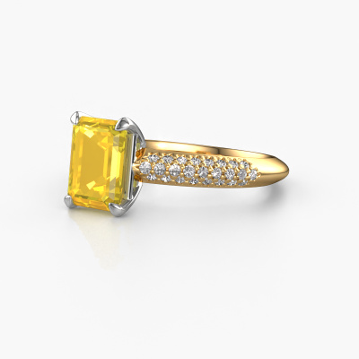 Der oben gezeigte Gold Verlobungsring wird Morane EME genannt. Es ist ein Pavé Solitär Ring, da er einen zentralen Edelstein und ein Band mit Pavé-Fassung hat. Der einzigartige Pavé Solitär Verlobungsring ist in der Kombination 14 Karat Gold mit Weißgold und ist mit einem smaragd schliff 8x6 mm Gelb Saphir-Mittelstein besetzt und das Band hat eine Pavé-Fassung mit Lab grown Diamant. Jedes Schmuckstück wird von unseren Meister-Goldschmieden in unserem eigenen Studio für Sie gefertigt. Um den zentralen Stein noch mehr zu betonen, hat das Band eine Pavé-Fassung mit weiteren Gelb Saphir. Durch die offenen Krappen kann das Licht aus mehreren Winkeln auf den Gelb Saphir treffen und der Gelb Saphir-Ring funkelt noch mehr. Das obere Foto zeigt die leidenschaftlich handgefertigten Details des Rings. Die hohe Positionierung der Mittelstein ist ein echter Blickfang. Der perfekte Verlobungsring für das Kronjuwel Ihres Lebens!Nach Erhalt Ihrer Bestellung beginnen unsere Goldschmiede mit Leidenschaft den kreativen Prozess und fertigen Ihren Verlobungsring in unserem eigenen Studio. Da wir keine großen Lager haben, werden diese Kosten nicht an Sie weitergegeben. Unsere Preisgestaltung ist der Beweis dafür! Wir bieten Schmuck zum niedrigsten Preis, garantiert.Unser Team fügt unserer Online-Kollektion täglich neue Designs hinzu. Unsere Designer und Goldschmiede arbeiten zusammen, um das beste Design zu kreieren. Wir bemühen uns, eine vielfältige Kollektion von Schmuckstücken anzubieten. Vielleicht haben Sie ein bestimmtes Design im Sinn. Eines, dass Sie irgendwo gesehen haben. Gerne geben wir Ihnen eine kostenlose Beratung. Wir machen Ihnen ein Angebot, basierend auf einem fairen Preis/Leistungsverhältnis, das Sie verblüffen wird.Um es einfacher zu machen, bieten wir eine kostenlose 30-tägige Rücksendung.