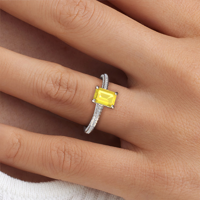 Der oben gezeigte Ring wird Elenore eme genannt. Es ist ein Pavé Solitär Ring, da er einen zentralen Edelstein und ein Band mit Pavé-Fassung hat. Dieser Platin ring ist mit einem 7x5 mm smaragd schliff Gelb Saphir-Mittelstein besetzt und das Band hat eine Pavé-Fassung mit Lab grown Diamant. Jedes Schmuckstück wird nur für Sie persönlich hergestellt, mit Liebe zum Detail und Design.Dieser exklusive Platin Pavé Solitär Verlobungsring mit Pavé-Fassung hat einen exquisiten, smaragd schliff Gelb Saphir als Mittelstein. Um den zentralen Stein noch mehr zu betonen, hat das Band eine Pavé-Fassung mit weiteren Lab grown Diamant. Durch die offenen Krappen kann das Licht aus mehreren Winkeln auf den Gelb Saphir treffen und der Gelb Saphir-Ring funkelt noch mehr. Das obere Foto zeigt die leidenschaftlich handgefertigten Details des Rings. Die hohe Positionierung der Mittelstein ist ein echter Blickfang. Der perfekte Verlobungsring für das Kronjuwel Ihres Lebens!Haben Sie ein bestimmtes Budget? Sie können uns gerne kontaktieren, damit wir Ihre Optionen besprechen können. Wir bieten unsere Verlobungsringe zum garantiert besten Preis, denn wir fertigen sie auf Bestellung. Solche Preise finden Sie nirgendwo anders!Haben Sie irgendwo einen bestimmten Verlobungsring gefunden, den Sie Ihrem Liebsten schenken möchten? Sie können uns gerne sagen, was Sie wollen und wir werden Ihr Design in einen Einzigartigen exklusive Verlobungsring verwandeln. Sie können die Entwicklungen Ihres Ringdesigns verfolgen, da wir 3D-Zeichnungen verwenden. Das gibt Ihnen eine realistische Vorschau, wie Ihr Design aussehen wird. Sie können auch einen Dummy vorbestellen. Ein Dummy ist ein Kunststoffring, der nach Ihrem Ringdesign gestaltet werden kann. Sie können ihn anprobieren und prüfen, ob seine Breite und Größe für Sie geeignet sind. Wir senden Ihnen gerne ein unverbindliches Angebot zu einem fairen Preis/Leistungsverhältnis. Sie werden in Anbetracht der Qualität des Rings und der Edelsteine überrascht sein.Um es einfacher zu machen, bieten wir eine kostenlose 30-tägige Rücksendung.