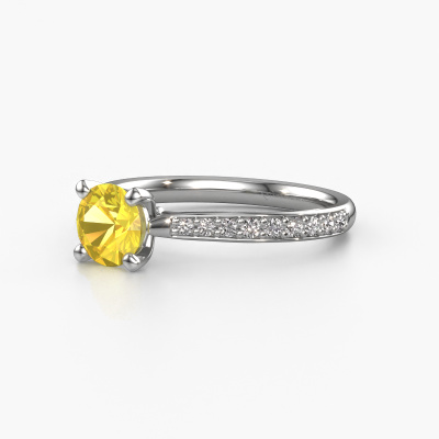 Der oben gezeigte Platin Verlobungsring wird Mignon rnd 2 genannt. Es ist ein Pavé Solitär Ring, da er einen zentralen Edelstein und ein Band mit Pavé-Fassung hat. Der Luxus Pavé Solitär Verlobungsring ist in der Kombination Platin mit Platin und ist mit einem rund 6 mm Gelb Saphir-Mittelstein besetzt und das Band hat eine Pavé-Fassung mit Lab grown Diamant. Jedes Schmuckstück wird hergestellt von einem Team leidenschaftlicher Goldschmiede und Schmuckdesigner. Das wird Ihr Kronjuwel unbedingt zu einem Blickfang machen. Um den zentralen Stein noch mehr zu betonen, hat das Band eine Pavé-Fassung mit weiteren Gelb Saphir. Durch die offenen Krappen kann das Licht aus mehreren Winkeln auf den Gelb Saphir treffen und der Gelb Saphir-Ring funkelt noch mehr. Das obere Foto zeigt die leidenschaftlich handgefertigten Details des Rings. Die hohe Positionierung der Mittelstein ist ein echter Blickfang. Der perfekte Verlobungsring für das Kronjuwel Ihres Lebens!Mit unserer modernen Technik können wir Schmuckstücke von höchster Qualität mit größter Sorgfalt für Sie entwerfen und anpassen. Unsere Verlobungsringe sind immer um 30 Prozent günstiger als bei anderen Juwelieren. Wir fertigen Verlobungsringe auf Bestellung, also müssen wir keine großen Lager unterhalten. Wenn Sie ein bestimmtes Budget haben, beraten wir Sie gerne entsprechend.Verschiedene Arten von neuen Ringen werden täglich von unserem Team angefertigt. Vielleicht haben Sie irgendwo einen Pavé Solitär Verlobungsring gefunden. Einen, den Sie Ihrem Liebsten schenken möchten. Bitte zögern Sie nicht, unseren Schmuckdesignern Ihre Gedanken und Ihr Design zu zeigen. Wir würden gerne Ihr Design in einen Luxus Verlobungsring verwandeln. Sie können die Entwicklungen Ihres Ringdesigns verfolgen, da wir sehr detaillierte 3D-Zeichnungen verwenden. Darüber hinaus können Sie einen Dummy des Designs bestellen. Ein Dummy ist ein Kunststoffring, der nach Ihrem Ringdesign gestaltet werden kann. Sie können ihn anprobieren und prüfen, ob der Verlobungsring Ihren Vorstellungen entspricht. Wir senden Ihnen gerne ein unverbindliches Angebot zu einem fairen Preis/Leistungsverhältnis. Das Angebot wird Sie angesichts der Qualität des Rings und der Edelsteine verblüffen.Um es einfacher zu machen, bieten wir eine kostenlose 30-tägige Rücksendung.