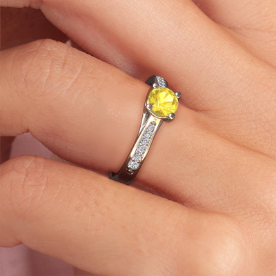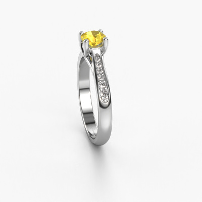 Der oben gezeigte Ring wird Mia 2 genannt. Es ist ein Pavé Solitär Ring, da er einen zentralen Edelstein und ein Band mit Pavé-Fassung hat. Dieser Platin ring ist mit einem 5 mm rund Gelb Saphir-Mittelstein besetzt und das Band hat eine Pavé-Fassung mit Lab grown Diamant. Jedes Schmuckstück wird nur für Sie persönlich hergestellt, mit Liebe zum Detail und Design.Dieser moderne Platin Pavé Solitär Verlobungsring mit Pavé-Fassung hat einen exquisiten, rund Gelb Saphir als Mittelstein. Um den zentralen Stein noch mehr zu betonen, hat das Band eine Pavé-Fassung mit weiteren Lab grown Diamant. Durch die offenen Krappen kann das Licht aus mehreren Winkeln auf den Gelb Saphir treffen und der Gelb Saphir-Ring funkelt noch mehr. Das obere Foto zeigt die leidenschaftlich handgefertigten Details des Rings. Die hohe Positionierung der Mittelstein ist ein echter Blickfang. Der perfekte Verlobungsring für das Kronjuwel Ihres Lebens!Mit unserer modernen Technik können wir Schmuckstücke von höchster Qualität mit größter Sorgfalt für Sie entwerfen und anpassen. Unsere Verlobungsringe sind immer um 30 Prozent günstiger als bei anderen Juwelieren. Wir fertigen Verlobungsringe auf Bestellung, also müssen wir keine großen Lager unterhalten. Wenn Sie ein bestimmtes Budget haben, beraten wir Sie gerne entsprechend.Verschiedene Arten von neuen Ringen werden täglich von unserem Team angefertigt. Vielleicht haben Sie irgendwo einen Pavé Solitär Verlobungsring gefunden. Einen, den Sie Ihrem Liebsten schenken möchten. Bitte zögern Sie nicht, unseren Schmuckdesignern Ihre Gedanken und Ihr Design zu zeigen. Wir würden gerne Ihr Design in einen moderne Verlobungsring verwandeln. Sie können die Entwicklungen Ihres Ringdesigns verfolgen, da wir sehr detaillierte 3D-Zeichnungen verwenden. Darüber hinaus können Sie einen Dummy des Designs bestellen. Ein Dummy ist ein Kunststoffring, der nach Ihrem Ringdesign gestaltet werden kann. Sie können ihn anprobieren und prüfen, ob der Verlobungsring Ihren Vorstellungen entspricht. Wir senden Ihnen gerne ein unverbindliches Angebot zu einem fairen Preis/Leistungsverhältnis. Das Angebot wird Sie angesichts der Qualität des Rings und der Edelsteine verblüffen.Um es einfacher zu machen, bieten wir eine kostenlose 30-tägige Rücksendung.