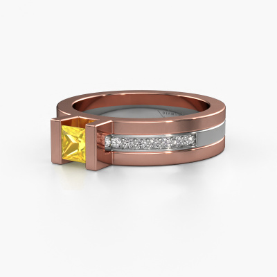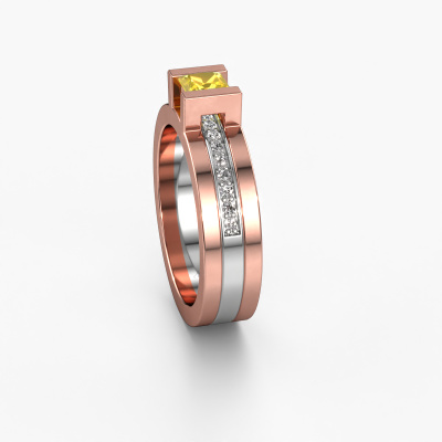 Der oben gezeigte Roségold Verlobungsring wird Desire genannt. Es ist ein Pavé Solitär Ring, da er einen zentralen Edelstein und ein Band mit Pavé-Fassung hat. Der moderne Pavé Solitär Verlobungsring ist in der Kombination 14 Karat Roségold mit Weißgold und ist mit einem princess 4 mm Gelb Saphir-Mittelstein besetzt und das Band hat eine Pavé-Fassung mit Diamanten. Jedes Schmuckstück wird von unseren Meister-Goldschmieden in unserem eigenen Studio für Sie gefertigt. Um den zentralen Stein noch mehr zu betonen, hat das Band eine Pavé-Fassung mit weiteren Gelb Saphir. Durch die offenen Krappen kann das Licht aus mehreren Winkeln auf den Gelb Saphir treffen und der Gelb Saphir-Ring funkelt noch mehr. Das obere Foto zeigt die leidenschaftlich handgefertigten Details des Rings. Die hohe Positionierung der Mittelstein ist ein echter Blickfang. Der perfekte Verlobungsring für das Kronjuwel Ihres Lebens!Durch die Kombination modernster Technik mit uralter Handwerkskunst können wir alle Verlobungsringe in unserem eigenen Studio anfertigen. Jedes Schmuckstück wird auf Anfrage gefertigt. Das ist vorteilhaft, weil wir Ihnen dadurch einen Preis anbieten können, den Sie nirgendwo anders finden.Haben Sie irgendwo einen bestimmten Verlobungsring gefunden, den Sie Ihrem Liebsten schenken möchten? Sie können uns gerne sagen, was Sie wollen und wir werden Ihr Design in einen Einzigartigen moderne Verlobungsring verwandeln. Sie können die Entwicklungen Ihres Ringdesigns verfolgen, da wir 3D-Zeichnungen verwenden. Das gibt Ihnen eine realistische Vorschau, wie Ihr Design aussehen wird. Sie können auch einen Dummy vorbestellen. Ein Dummy ist ein Kunststoffring, der nach Ihrem Ringdesign gestaltet werden kann. Sie können ihn anprobieren und prüfen, ob seine Breite und Größe für Sie geeignet sind. Wir senden Ihnen gerne ein unverbindliches Angebot zu einem fairen Preis/Leistungsverhältnis. Sie werden in Anbetracht der Qualität des Rings und der Edelsteine überrascht sein.Um es einfacher zu machen, bieten wir eine kostenlose 30-tägige Rücksendung.