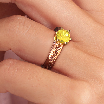 Der oben gezeigte Verlobungsring wird Shan genannt. Wir nennen das einen Solitär-Ring, denn er hat einen einzelnen Edelstein. Es ist ein 14 Karat Roségold ring, mit 6 mm rund Gelb Saphir. Das Besondere an unserem Konfigurator ist dass Sie selbst einem Schmuckstück zusammenstellen können zu einem eigenen persönlichen Schmuckstück. Dieser Solitäre Verlobungsring ist gefertigt in der Edelmetall Kombination Roségold mit Gold, aber Sie können also auch wählen aus anderen Farben. Jedes Schmuckstück wird hergestellt von einem Team leidenschaftlicher Goldschmiede und Schmuckdesigner. Das wird Ihr Kronjuwel unbedingt zu einem Blickfang machen. Der Solitär-Verlobungsring ist eine Sonderform des Verlobungsring. Seine offenen Krappen ermöglichen, dass Licht aus mehr Winkeln auf den Edelstein trifft. Dieser Keltische Verlobungsring ist durch die hohe Positionierung des Edelsteins ein atemberaubender Blickfang. Wir schmücken diesen Solitär-Ring sorgfältig von Hand, damit Sie Ihren Anfrage mit einem einzigartigen Ring würdigen können. Die Liebe Ihres Lebens verdient nur das Beste. Mit unserer modernen Technik können wir Schmuckstücke von höchster Qualität mit größter Sorgfalt für Sie entwerfen und anpassen. Unsere Verlobungsringe sind immer um 30 Prozent günstiger als bei anderen Juwelieren. Wir fertigen Verlobungsringe auf Bestellung, also müssen wir keine großen Lager unterhalten. Wenn Sie ein bestimmtes Budget haben, beraten wir Sie gerne entsprechend.Haben Sie irgendwo einen bestimmten Verlobungsring gefunden, den Sie Ihrem Liebsten schenken möchten? Sie können uns gerne sagen, was Sie wollen und wir werden Ihr Design in einen Einzigartigen Keltische Verlobungsring verwandeln. Sie können die Entwicklungen Ihres Ringdesigns verfolgen, da wir 3D-Zeichnungen verwenden. Das gibt Ihnen eine realistische Vorschau, wie Ihr Design aussehen wird. Sie können auch einen Dummy vorbestellen. Ein Dummy ist ein Kunststoffring, der nach Ihrem Ringdesign gestaltet werden kann. Sie können ihn anprobieren und prüfen, ob seine Breite und Größe für Sie geeignet sind. Wir senden Ihnen gerne ein unverbindliches Angebot zu einem fairen Preis/Leistungsverhältnis. Sie werden in Anbetracht der Qualität des Rings und der Edelsteine überrascht sein.Um es einfacher zu machen, bieten wir eine kostenlose 30-tägige Rücksendung.