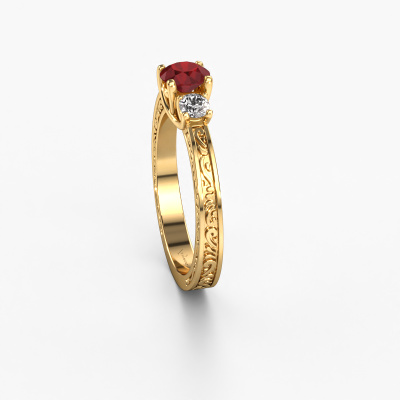 Dieser Verlobungsring aus 14 Karat Gold heißt Betty 1 und hat einen Rubin Edelstein. Ein außergewöhnlicher, Gold Vintage Ring. Einer, der die Liebe Ihres Lebens mit Sicherheit wie ein Rubin erstrahlen lässt! Das hoffen wir zu erreichen. Dieser Keltische Verlobungsring ist mit exquisiten Rubin besetzt. Welchen Edelstein Sie aus unserer Auswahl haben möchten, liegt ganz bei Ihnen. Der Edelstein wird mit großer Sorgfalt ausgewählt. Denn wir glauben, dass Ihr Verlobungsring nur mit dem schönsten Edelstein gekrönt sein darf. Sehen Sie das auch so? Unser erfahrener Juwelier entwirft Ihren Ring in unserem eigenen Studio, wo der Rubin mit großer Präzision eingefasst wird. Der Ring wird dann bearbeitet und poliert, bis er perfekt ist. Nichts als das Beste für die Liebe Ihres Lebens! Jedes Schmuckstück ist um Ihrem Finger Glanz zu verleihen. Jeder Ring wird von unseren Goldschmieden liebevoll von Hand gefertigt.Haben Sie ein bestimmtes Budget? Sie können uns gerne kontaktieren, damit wir Ihre Optionen besprechen können. Wir bieten unsere Verlobungsringe zum garantiert besten Preis, denn wir fertigen sie auf Bestellung. Solche Preise finden Sie nirgendwo anders!Unser Team fügt unserer Online-Kollektion täglich neue Designs hinzu. Unsere Designer und Goldschmiede arbeiten zusammen, um das beste Design zu kreieren. Wir bemühen uns, eine vielfältige Kollektion von Schmuckstücken anzubieten. Vielleicht haben Sie ein bestimmtes Design im Sinn. Eines, dass Sie irgendwo gesehen haben. Gerne geben wir Ihnen eine kostenlose Beratung. Wir machen Ihnen ein Angebot, basierend auf einem fairen Preis/Leistungsverhältnis, das Sie verblüffen wird.Um es einfacher zu machen, bieten wir eine kostenlose 30-tägige Rücksendung.