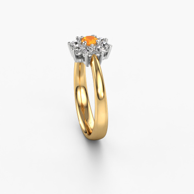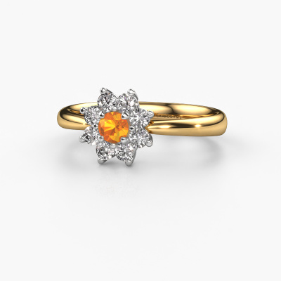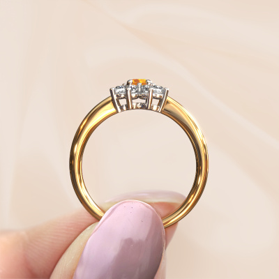 Der oben gezeigte Ring wird Camille 1 genannt. Ein Flower Ring mit einem zentralen Edelstein, umgeben von kleineren Steinen, wir nennen das einen Cluster Ring. Diese Version in 14 Karat Gold hat einen 3.4 mm rund Citrin als Mittelstein, umschlossen von kleineren Diamanten. Der traditionell, Gold Flower Verlobungsring zeichnet sich durch seine Form aus. Zusammen bilden die kleineren und größeren Citrin eine Blume und scheinen zu einem großen, funkelnden Edelstein zu verschmelzen. Dieser traditionell Verlobungsring wird auch als Blumen- oder Rosettenring bezeichnet. Unsere erfahrenen Juweliere stellen sicher, dass die kleineren Diamanten identisch gesetzt sind, so dass es an dem Citrin keine Lichtstörungen gibt, sondern sie stattdessen eine Einheit bilden. Mit perfekter Präzision und geschickter Hand wird jeder Citrin in den Ring gesetzt. Während der Herstellung wird alles ständig überwacht, um sicherzustellen, dass das Licht einwandfrei reflektiert wird. Das alles führt zu einem einzigartigen Verlobungsring mit einem strahlenden Citrin in seiner Mitte. Ein schönes, bedeutungsvolles Geschenk, um es der Liebe Ihres Lebens zu schenken. Mit unserer modernen Technik können wir Schmuckstücke von höchster Qualität mit größter Sorgfalt für Sie entwerfen und anpassen. Unsere Verlobungsringe sind immer um 30 Prozent günstiger als bei anderen Juwelieren. Wir fertigen Verlobungsringe auf Bestellung, also müssen wir keine großen Lager unterhalten. Wenn Sie ein bestimmtes Budget haben, beraten wir Sie gerne entsprechend.Unser Team fügt unserer Online-Kollektion täglich neue Designs hinzu. Unsere Designer und Goldschmiede arbeiten zusammen, um das beste Design zu kreieren. Wir bemühen uns, eine vielfältige Kollektion von Schmuckstücken anzubieten. Vielleicht haben Sie ein bestimmtes Design im Sinn. Eines, dass Sie irgendwo gesehen haben. Gerne geben wir Ihnen eine kostenlose Beratung. Wir machen Ihnen ein Angebot, basierend auf einem fairen Preis/Leistungsverhältnis, das Sie verblüffen wird.Um es einfacher zu machen, bieten wir eine kostenlose 30-tägige Rücksendung.