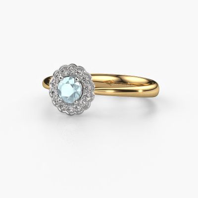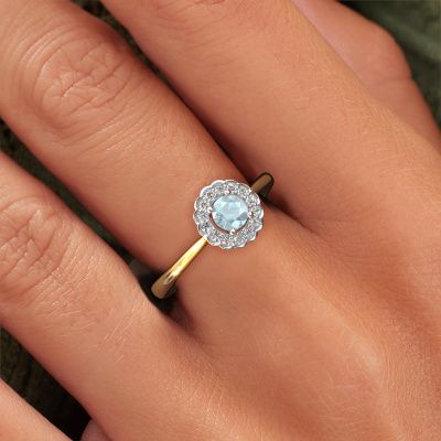 Der oben gezeigte Verlobungsring wird Debi genannt. Es ist ein Halo Ring, da er einen zentralen Edelstein und ein Band mit Pavé-Fassung hat. Der 14 Karat Gold ring ist mit einem 4.2 mm rund Aquamarin-Mittelstein besetzt und um ihn herum eine Pavé-Fassung mit Diamanten. Was diesen klassische, Gold Halo Ring besonders macht, sind die kleineren Steine, die den zentralen Stein umschließen. Dieser wunderschöne Verlobungsring wird als Halo Ring bezeichnet, da die kleineren Edelsteine dem zentralen Stein einen Lichthof geben. Damit die kleineren Steine den Mittelstein verstärken, müssen sie so platziert werden, dass keine Lichteinflüsse auftreten. Und hier kommen unsere erfahrenen Goldschmiede ins Spiel. Jeder einzelne Stein wird sorgfältig von Hand in den Ring gesetzt. Während der Herstellung wird der Lichteinfall ständig überprüft. So können wir sicherstellen, dass der spezielle Lichtkranz noch sichtbar ist. Am Ende erhalten Sie einen einzigartigen Verlobungsring mit einem Aquamarins Ihrer Wahl in der Mitte. Sie können sich die Wirkung eines solchen Ringes vorstellen, wenn Sie ihn an ihrem besonderen Tag für sie zum Leuchten bringen. Da wir unsere eigenen Ringe entwerfen und liefern, können wir Ihnen einen Verlobungsring zu einem Preis anbieten, den Sie nirgendwo anders finden. Ein Ring wird auf Bestellung angefertigt, wodurch kein überschüssiges Material anfällt. So können wir Ihnen ein gutes Angebot zum besten Preis machen. Wir verstehen, dass es sich riskant anfühlt, Ihren Verlobungsring online zu kaufen. Jedoch helfen wir Ihnen gerne beim Designprozess unter Berücksichtigung Ihres Budgets.Unser Team fügt unserer Online-Kollektion täglich neue Designs hinzu. Unsere Designer und Goldschmiede arbeiten zusammen, um das beste Design zu kreieren. Wir bemühen uns, eine vielfältige Kollektion von Schmuckstücken anzubieten. Vielleicht haben Sie ein bestimmtes Design im Sinn. Eines, dass Sie irgendwo gesehen haben. Gerne geben wir Ihnen eine kostenlose Beratung. Wir machen Ihnen ein Angebot, basierend auf einem fairen Preis/Leistungsverhältnis, das Sie verblüffen wird.Um es einfacher zu machen, bieten wir eine kostenlose 30-tägige Rücksendung.