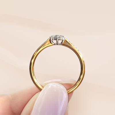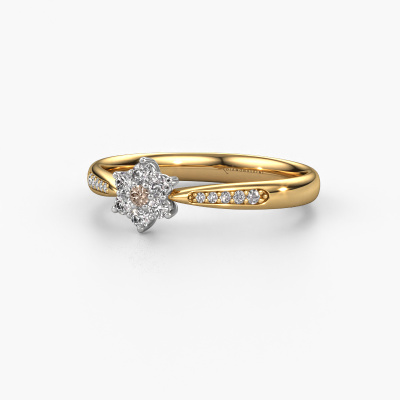Der oben gezeigte Ring wird Chantal 2 genannt. Ein Cluster Ring mit einem zentralen Edelstein, umgeben von kleineren Steinen, wir nennen das einen Cluster Ring. Diese Version in 14 Karat Gold hat einen 0.02 crt rund Braun Diamant als Mittelstein, umschlossen von kleineren Lab grown Diamant. Wenn Sie einen Gold Cluster Verlobungsring sehen, werden Sie vielleicht den Eindruck bekommen, dass seine kleineren Steine mit dem größeren Braun Diamant aufeinanderprallen. Deshalb ist er wie eine Blume geformt. Deshalb ist dieser Verlobungsring auch als Blumen- oder Rosetten Fassung bekannt. Es ist sehr wichtig, dass die kleineren Lab grown Diamant identisch positioniert sind, so dass es kein Spiel im Licht, sondern eine perfekte Einheit ergibt. Unsere erfahrenen Juweliere erledigen diese Arbeit. Jeder einzelne Stein wird sorgfältig von Hand gesetzt. Während der Herstellung wird der Lichteinfall ständig überwacht. Am Ende bekommen Sie den perfekten Verlobungsring mit einem strahlenden Braun Diamant Edelstein Herzstück. Sie können sich die Wirkung eines solchen Ringes vorstellen, wenn Sie ihn an ihrem besonderen Tag für die Liebe Ihres Lebens zum Leuchten bringen. Nach Erhalt Ihrer Bestellung beginnen unsere Goldschmiede mit Leidenschaft den kreativen Prozess und fertigen Ihren Verlobungsring in unserem eigenen Studio. Da wir keine großen Lager haben, werden diese Kosten nicht an Sie weitergegeben. Unsere Preisgestaltung ist der Beweis dafür! Wir bieten Schmuck zum niedrigsten Preis, garantiert.Haben Sie irgendwo einen bestimmten Verlobungsring gefunden, den Sie Ihrem Liebsten schenken möchten? Sie können uns gerne sagen, was Sie wollen und wir werden Ihr Design in einen Einzigartigen traditionell Verlobungsring verwandeln. Sie können die Entwicklungen Ihres Ringdesigns verfolgen, da wir 3D-Zeichnungen verwenden. Das gibt Ihnen eine realistische Vorschau, wie Ihr Design aussehen wird. Sie können auch einen Dummy vorbestellen. Ein Dummy ist ein Kunststoffring, der nach Ihrem Ringdesign gestaltet werden kann. Sie können ihn anprobieren und prüfen, ob seine Breite und Größe für Sie geeignet sind. Wir senden Ihnen gerne ein unverbindliches Angebot zu einem fairen Preis/Leistungsverhältnis. Sie werden in Anbetracht der Qualität des Rings und der Edelsteine überrascht sein.Um es einfacher zu machen, bieten wir eine kostenlose 30-tägige Rücksendung.