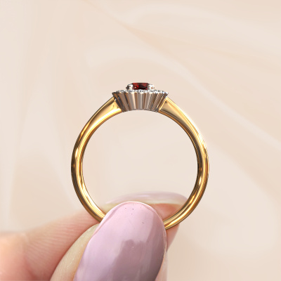 Der oben gezeigte Verlobungsring wird Debi genannt. Es ist ein Halo Ring, da er einen zentralen Edelstein und ein Band mit Pavé-Fassung hat. Der 14 Karat Gold ring ist mit einem 4.2 mm rund Granat-Mittelstein besetzt und um ihn herum eine Pavé-Fassung mit Diamanten. Was diesen klassische, Gold Halo Ring besonders macht, sind die kleineren Steine, die den zentralen Stein umschließen. Dieser wunderschöne Verlobungsring wird als Halo Ring bezeichnet, da die kleineren Edelsteine dem zentralen Stein einen Lichthof geben. Damit die kleineren Steine den Mittelstein verstärken, müssen sie so platziert werden, dass keine Lichteinflüsse auftreten. Und hier kommen unsere erfahrenen Goldschmiede ins Spiel. Jeder einzelne Stein wird sorgfältig von Hand in den Ring gesetzt. Während der Herstellung wird der Lichteinfall ständig überprüft. So können wir sicherstellen, dass der spezielle Lichtkranz noch sichtbar ist. Am Ende erhalten Sie einen einzigartigen Verlobungsring mit einem Granat Ihrer Wahl in der Mitte. Sie können sich die Wirkung eines solchen Ringes vorstellen, wenn Sie ihn an ihrem besonderen Tag für sie zum Leuchten bringen. Da wir unsere eigenen Ringe entwerfen und liefern, können wir Ihnen einen Verlobungsring zu einem Preis anbieten, den Sie nirgendwo anders finden. Ein Ring wird auf Bestellung angefertigt, wodurch kein überschüssiges Material anfällt. So können wir Ihnen ein gutes Angebot zum besten Preis machen. Wir verstehen, dass es sich riskant anfühlt, Ihren Verlobungsring online zu kaufen. Jedoch helfen wir Ihnen gerne beim Designprozess unter Berücksichtigung Ihres Budgets.Unser Team fügt unserer Online-Kollektion täglich neue Designs hinzu. Unsere Designer und Goldschmiede arbeiten zusammen, um das beste Design zu kreieren. Wir bemühen uns, eine vielfältige Kollektion von Schmuckstücken anzubieten. Vielleicht haben Sie ein bestimmtes Design im Sinn. Eines, dass Sie irgendwo gesehen haben. Gerne geben wir Ihnen eine kostenlose Beratung. Wir machen Ihnen ein Angebot, basierend auf einem fairen Preis/Leistungsverhältnis, das Sie verblüffen wird.Um es einfacher zu machen, bieten wir eine kostenlose 30-tägige Rücksendung.