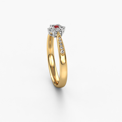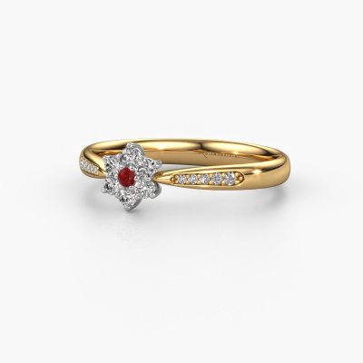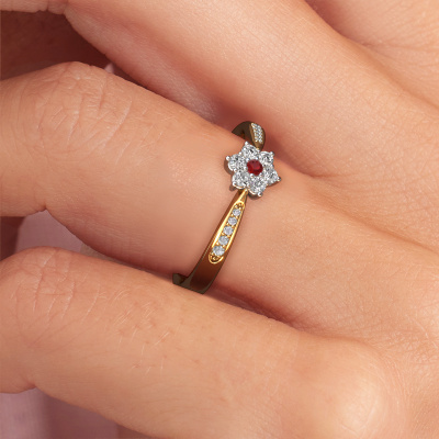 Der oben gezeigte Ring wird Chantal 2 genannt. Ein Cluster Ring mit einem zentralen Edelstein, umgeben von kleineren Steinen, wir nennen das einen Cluster Ring. Diese Version in 14 Karat Gold hat einen 1.7 mm rund Rubin als Mittelstein, umschlossen von kleineren Lab grown Diamant. Wenn Sie einen Gold Cluster Verlobungsring sehen, werden Sie vielleicht den Eindruck bekommen, dass seine kleineren Steine mit dem größeren Rubin aufeinanderprallen. Deshalb ist er wie eine Blume geformt. Deshalb ist dieser Verlobungsring auch als Blumen- oder Rosetten Fassung bekannt. Es ist sehr wichtig, dass die kleineren Lab grown Diamant identisch positioniert sind, so dass es kein Spiel im Licht, sondern eine perfekte Einheit ergibt. Unsere erfahrenen Juweliere erledigen diese Arbeit. Jeder einzelne Stein wird sorgfältig von Hand gesetzt. Während der Herstellung wird der Lichteinfall ständig überwacht. Am Ende bekommen Sie den perfekten Verlobungsring mit einem strahlenden Rubin Edelstein Herzstück. Sie können sich die Wirkung eines solchen Ringes vorstellen, wenn Sie ihn an ihrem besonderen Tag für die Liebe Ihres Lebens zum Leuchten bringen. Nach Erhalt Ihrer Bestellung beginnen unsere Goldschmiede mit Leidenschaft den kreativen Prozess und fertigen Ihren Verlobungsring in unserem eigenen Studio. Da wir keine großen Lager haben, werden diese Kosten nicht an Sie weitergegeben. Unsere Preisgestaltung ist der Beweis dafür! Wir bieten Schmuck zum niedrigsten Preis, garantiert.Haben Sie irgendwo einen bestimmten Verlobungsring gefunden, den Sie Ihrem Liebsten schenken möchten? Sie können uns gerne sagen, was Sie wollen und wir werden Ihr Design in einen Einzigartigen traditionell Verlobungsring verwandeln. Sie können die Entwicklungen Ihres Ringdesigns verfolgen, da wir 3D-Zeichnungen verwenden. Das gibt Ihnen eine realistische Vorschau, wie Ihr Design aussehen wird. Sie können auch einen Dummy vorbestellen. Ein Dummy ist ein Kunststoffring, der nach Ihrem Ringdesign gestaltet werden kann. Sie können ihn anprobieren und prüfen, ob seine Breite und Größe für Sie geeignet sind. Wir senden Ihnen gerne ein unverbindliches Angebot zu einem fairen Preis/Leistungsverhältnis. Sie werden in Anbetracht der Qualität des Rings und der Edelsteine überrascht sein.Um es einfacher zu machen, bieten wir eine kostenlose 30-tägige Rücksendung.