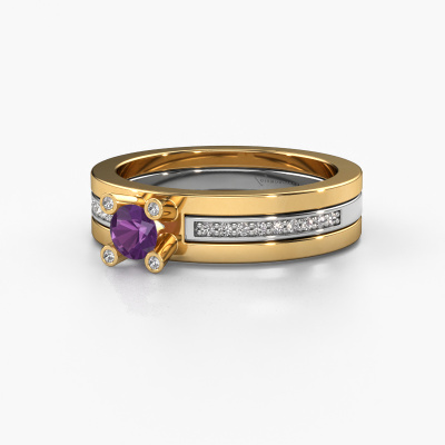 Der oben gezeigte Gold Verlobungsring wird Alisha genannt. Es ist ein Pavé Solitär Ring, da er einen zentralen Edelstein und ein Band mit Pavé-Fassung hat. Der design Pavé Solitär Verlobungsring ist in der Kombination 14 Karat Gold mit Weißgold und ist mit einem rund 4 mm Amethyst-Mittelstein besetzt und das Band hat eine Pavé-Fassung mit Diamanten. Jedes Schmuckstück ist einzigartig in jeder Hinsicht! Einfach nach Ihren Wünschen anzupassen. Um den zentralen Stein noch mehr zu betonen, hat das Band eine Pavé-Fassung mit weiteren Amethyst. Durch die offenen Krappen kann das Licht aus mehreren Winkeln auf den Amethyst treffen und der Amethyst-Ring funkelt noch mehr. Das obere Foto zeigt die leidenschaftlich handgefertigten Details des Rings. Die hohe Positionierung der Mittelstein ist ein echter Blickfang. Der perfekte Verlobungsring für das Kronjuwel Ihres Lebens!Durch die Kombination modernster Technik mit uralter Handwerkskunst können wir alle Verlobungsringe in unserem eigenen Studio anfertigen. Jedes Schmuckstück wird auf Anfrage gefertigt. Das ist vorteilhaft, weil wir Ihnen dadurch einen Preis anbieten können, den Sie nirgendwo anders finden.Haben Sie irgendwo einen bestimmten Verlobungsring gefunden, den Sie Ihrem Liebsten schenken möchten? Sie können uns gerne sagen, was Sie wollen und wir werden Ihr Design in einen Einzigartigen design Verlobungsring verwandeln. Sie können die Entwicklungen Ihres Ringdesigns verfolgen, da wir 3D-Zeichnungen verwenden. Das gibt Ihnen eine realistische Vorschau, wie Ihr Design aussehen wird. Sie können auch einen Dummy vorbestellen. Ein Dummy ist ein Kunststoffring, der nach Ihrem Ringdesign gestaltet werden kann. Sie können ihn anprobieren und prüfen, ob seine Breite und Größe für Sie geeignet sind. Wir senden Ihnen gerne ein unverbindliches Angebot zu einem fairen Preis/Leistungsverhältnis. Sie werden in Anbetracht der Qualität des Rings und der Edelsteine überrascht sein.Um es einfacher zu machen, bieten wir eine kostenlose 30-tägige Rücksendung.