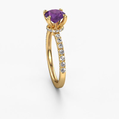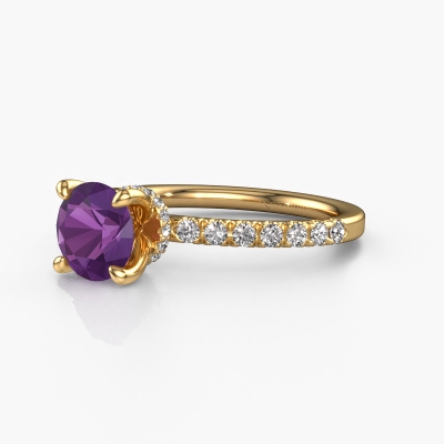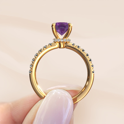 Der oben gezeigte Gold Verlobungsring wird Crystal rnd 4 genannt. Es ist ein Pavé Solitär Ring, da er einen zentralen Edelstein und ein Band mit Pavé-Fassung hat. Der Fantasie Pavé Solitär Verlobungsring ist in der Kombination 14 Karat Gold mit Gold und ist mit einem rund 7 mm Amethyst-Mittelstein besetzt und das Band hat eine Pavé-Fassung mit Lab grown Diamant. Jedes Schmuckstück lässt Ihren Finger erstrahlen. Ihr Ring ist mit Liebe von unseren Goldschmieden handgefertigt. Um den zentralen Stein noch mehr zu betonen, hat das Band eine Pavé-Fassung mit weiteren Amethyst. Durch die offenen Krappen kann das Licht aus mehreren Winkeln auf den Amethyst treffen und der Amethyst-Ring funkelt noch mehr. Das obere Foto zeigt die leidenschaftlich handgefertigten Details des Rings. Die hohe Positionierung der Mittelstein ist ein echter Blickfang. Der perfekte Verlobungsring für das Kronjuwel Ihres Lebens!Mit unserer modernen Technik können wir Schmuckstücke von höchster Qualität mit größter Sorgfalt für Sie entwerfen und anpassen. Unsere Verlobungsringe sind immer um 30 Prozent günstiger als bei anderen Juwelieren. Wir fertigen Verlobungsringe auf Bestellung, also müssen wir keine großen Lager unterhalten. Wenn Sie ein bestimmtes Budget haben, beraten wir Sie gerne entsprechend.Haben Sie irgendwo einen bestimmten Verlobungsring gefunden, den Sie Ihrem Liebsten schenken möchten? Sie können uns gerne sagen, was Sie wollen und wir werden Ihr Design in einen Einzigartigen Fantasie Verlobungsring verwandeln. Sie können die Entwicklungen Ihres Ringdesigns verfolgen, da wir 3D-Zeichnungen verwenden. Das gibt Ihnen eine realistische Vorschau, wie Ihr Design aussehen wird. Sie können auch einen Dummy vorbestellen. Ein Dummy ist ein Kunststoffring, der nach Ihrem Ringdesign gestaltet werden kann. Sie können ihn anprobieren und prüfen, ob seine Breite und Größe für Sie geeignet sind. Wir senden Ihnen gerne ein unverbindliches Angebot zu einem fairen Preis/Leistungsverhältnis. Sie werden in Anbetracht der Qualität des Rings und der Edelsteine überrascht sein.Um es einfacher zu machen, bieten wir eine kostenlose 30-tägige Rücksendung.
