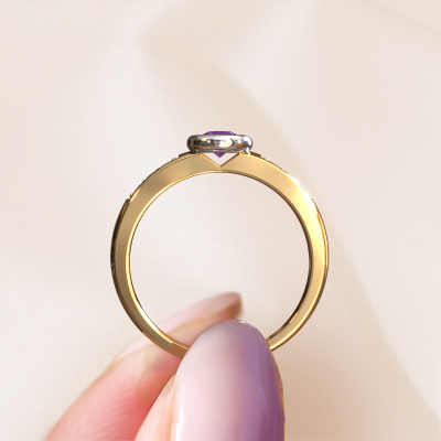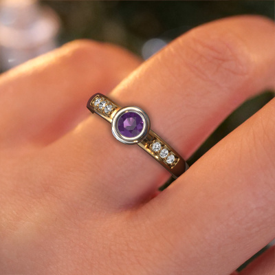 Der oben gezeigte Gold Verlobungsring wird Lieke genannt. Es ist ein Pavé Solitär Ring, da er einen zentralen Edelstein und ein Band mit Pavé-Fassung hat. Der klassische Pavé Solitär Verlobungsring ist in der Kombination 14 Karat Gold mit Weißgold und ist mit einem rund 4 mm Amethyst-Mittelstein besetzt und das Band hat eine Pavé-Fassung mit Diamanten. Jedes Schmuckstück ist einzigartig in jeder Hinsicht! Einfach nach Ihren Wünschen anzupassen. Um den zentralen Stein noch mehr zu betonen, hat das Band eine Pavé-Fassung mit weiteren Amethyst. Durch die offenen Krappen kann das Licht aus mehreren Winkeln auf den Amethyst treffen und der Amethyst-Ring funkelt noch mehr. Das obere Foto zeigt die leidenschaftlich handgefertigten Details des Rings. Die hohe Positionierung der Mittelstein ist ein echter Blickfang. Der perfekte Verlobungsring für das Kronjuwel Ihres Lebens!Durch die Kombination modernster Technik mit uralter Handwerkskunst können wir alle Verlobungsringe in unserem eigenen Studio anfertigen. Jedes Schmuckstück wird auf Anfrage gefertigt. Das ist vorteilhaft, weil wir Ihnen dadurch einen Preis anbieten können, den Sie nirgendwo anders finden.Verschiedene Arten von neuen Ringen werden täglich von unserem Team angefertigt. Vielleicht haben Sie irgendwo einen Pavé Solitär Verlobungsring gefunden. Einen, den Sie Ihrem Liebsten schenken möchten. Bitte zögern Sie nicht, unseren Schmuckdesignern Ihre Gedanken und Ihr Design zu zeigen. Wir würden gerne Ihr Design in einen klassische Verlobungsring verwandeln. Sie können die Entwicklungen Ihres Ringdesigns verfolgen, da wir sehr detaillierte 3D-Zeichnungen verwenden. Darüber hinaus können Sie einen Dummy des Designs bestellen. Ein Dummy ist ein Kunststoffring, der nach Ihrem Ringdesign gestaltet werden kann. Sie können ihn anprobieren und prüfen, ob der Verlobungsring Ihren Vorstellungen entspricht. Wir senden Ihnen gerne ein unverbindliches Angebot zu einem fairen Preis/Leistungsverhältnis. Das Angebot wird Sie angesichts der Qualität des Rings und der Edelsteine verblüffen.Um es einfacher zu machen, bieten wir eine kostenlose 30-tägige Rücksendung.