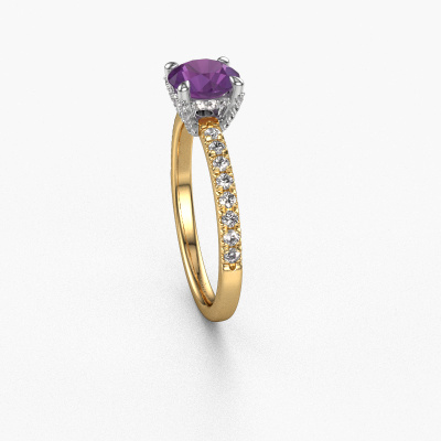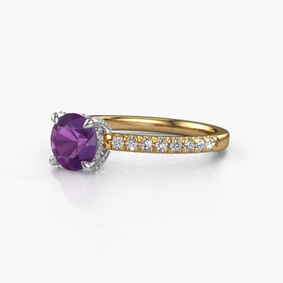 Der oben gezeigte Gold Verlobungsring wird Saskia rnd 1 genannt. Es ist ein Pavé Solitär Ring, da er einen zentralen Edelstein und ein Band mit Pavé-Fassung hat. Der exklusive Pavé Solitär Verlobungsring ist in der Kombination 14 Karat Gold mit Weißgold und ist mit einem rund 6.5 mm Amethyst-Mittelstein besetzt und das Band hat eine Pavé-Fassung mit Lab grown Diamant. Jedes Schmuckstück wird hergestellt mit Leidenschaft und Liebe, von einem unserer Meister-Goldschmiede. Um den zentralen Stein noch mehr zu betonen, hat das Band eine Pavé-Fassung mit weiteren Amethyst. Durch die offenen Krappen kann das Licht aus mehreren Winkeln auf den Amethyst treffen und der Amethyst-Ring funkelt noch mehr. Das obere Foto zeigt die leidenschaftlich handgefertigten Details des Rings. Die hohe Positionierung der Mittelstein ist ein echter Blickfang. Der perfekte Verlobungsring für das Kronjuwel Ihres Lebens!Durch die Kombination modernster Technik mit uralter Handwerkskunst können wir alle Verlobungsringe in unserem eigenen Studio anfertigen. Jedes Schmuckstück wird auf Anfrage gefertigt. Das ist vorteilhaft, weil wir Ihnen dadurch einen Preis anbieten können, den Sie nirgendwo anders finden.Haben Sie einen bestimmten Ring im Sinn? Eines, dass Sie irgendwo gesehen haben. Bitte zögern Sie nicht, uns zu sagen, was Sie wollen und wir werden Ihr Design in einen Einzigartigen Verlobungsring verwandeln. Sie können die Entwicklungen Ihres Ringdesigns verfolgen, da wir 3D-Zeichnungen verwenden. Das gibt Ihnen eine realistische Vorschau Ihres Designs. Wir senden Ihnen gerne ein unverbindliches Angebot zu einem fairen Preis/Leistungsverhältnis. Es wird Sie erstaunen.Um es einfacher zu machen, bieten wir eine kostenlose 30-tägige Rücksendung.