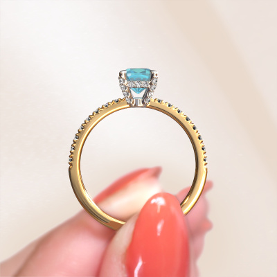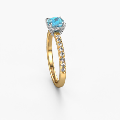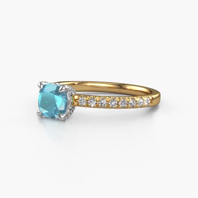 Der oben gezeigte Gold Verlobungsring wird Saskia 1 cus genannt. Es ist ein Pavé Solitär Ring, da er einen zentralen Edelstein und ein Band mit Pavé-Fassung hat. Der einzigartige Pavé Solitär Verlobungsring ist in der Kombination 14 Karat Gold mit Weißgold und ist mit einem cussion 5.5 mm Blau Topas-Mittelstein besetzt und das Band hat eine Pavé-Fassung mit Diamanten. Jedes Schmuckstück wird hergestellt von einem Team leidenschaftlicher Goldschmiede und Schmuckdesigner. Das wird Ihr Kronjuwel unbedingt zu einem Blickfang machen. Um den zentralen Stein noch mehr zu betonen, hat das Band eine Pavé-Fassung mit weiteren Blau Topas. Durch die offenen Krappen kann das Licht aus mehreren Winkeln auf den Blau Topas treffen und der Blau Topas-Ring funkelt noch mehr. Das obere Foto zeigt die leidenschaftlich handgefertigten Details des Rings. Die hohe Positionierung der Mittelstein ist ein echter Blickfang. Der perfekte Verlobungsring für das Kronjuwel Ihres Lebens!Durch die Kombination modernster Technik mit uralter Handwerkskunst können wir alle Verlobungsringe in unserem eigenen Studio anfertigen. Jedes Schmuckstück wird auf Anfrage gefertigt. Das ist vorteilhaft, weil wir Ihnen dadurch einen Preis anbieten können, den Sie nirgendwo anders finden.Unser Team fügt unserer Online-Kollektion täglich neue Designs hinzu. Unsere Designer und Goldschmiede arbeiten zusammen, um das beste Design zu kreieren. Wir bemühen uns, eine vielfältige Kollektion von Schmuckstücken anzubieten. Vielleicht haben Sie ein bestimmtes Design im Sinn. Eines, dass Sie irgendwo gesehen haben. Gerne geben wir Ihnen eine kostenlose Beratung. Wir machen Ihnen ein Angebot, basierend auf einem fairen Preis/Leistungsverhältnis, das Sie verblüffen wird.Um es einfacher zu machen, bieten wir eine kostenlose 30-tägige Rücksendung.
