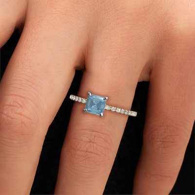 Der oben gezeigte Gold Verlobungsring wird Crystal ASSC 4 genannt. Es ist ein Pavé Solitär Ring, da er einen zentralen Edelstein und ein Band mit Pavé-Fassung hat. Der exklusive Pavé Solitär Verlobungsring ist in der Kombination 585 Gold mit Weißgold und ist mit einem asscher 5.5 mm blauer Labordiamant-Mittelstein besetzt und das Band hat eine Pavé-Fassung mit Diamanten. Jedes Schmuckstück wird hergestellt mit Leidenschaft und Liebe, von einem unserer Meister-Goldschmiede. Um den zentralen Stein noch mehr zu betonen, hat das Band eine Pavé-Fassung mit weiteren blauer Labordiamant. Durch die offenen Krappen kann das Licht aus mehreren Winkeln auf den blauer Labordiamant treffen und der blauer Labordiamant-Ring funkelt noch mehr. Das obere Foto zeigt die leidenschaftlich handgefertigten Details des Rings. Die hohe Positionierung der Mittelstein ist ein echter Blickfang. Der perfekte Verlobungsring für das Kronjuwel Ihres Lebens!Durch die Kombination modernster Technik mit uralter Handwerkskunst können wir alle Verlobungsringe in unserem eigenen Studio anfertigen. Jedes Schmuckstück wird auf Anfrage gefertigt. Das ist vorteilhaft, weil wir Ihnen dadurch einen Preis anbieten können, den Sie nirgendwo anders finden.Unser Team fügt unserer Online-Kollektion täglich neue Designs hinzu. Unsere Designer und Goldschmiede arbeiten zusammen, um das beste Design zu kreieren. Wir bemühen uns, eine vielfältige Kollektion von Schmuckstücken anzubieten. Vielleicht haben Sie ein bestimmtes Design im Sinn. Eines, dass Sie irgendwo gesehen haben. Gerne geben wir Ihnen eine kostenlose Beratung. Wir machen Ihnen ein Angebot, basierend auf einem fairen Preis/Leistungsverhältnis, das Sie verblüffen wird.Um es einfacher zu machen, bieten wir eine kostenlose 30-tägige Rücksendung.